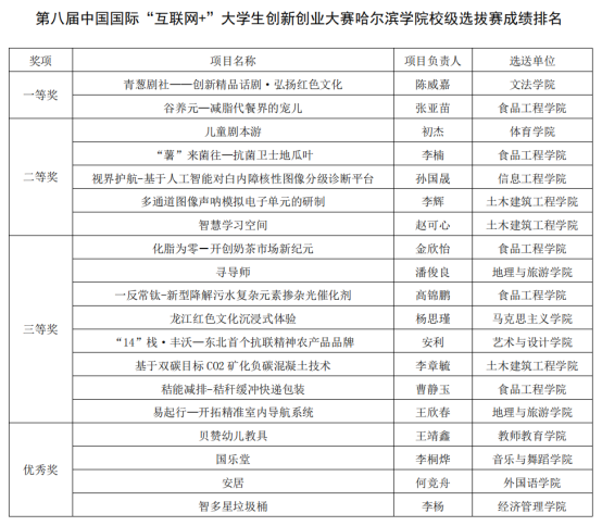 本次大赛邀请中国国际“互联网+”大学生创新创业大赛国赛评委王中伟,黑龙江省推进数字龙江建设专家委员会副主任委员王政铎,黑龙江省科技厅创业导师王新哲、用友网络科技股份有限公司黑龙江分公司总经理张海冰以及龙媒社黑龙江文化传媒公司创始人魏丹担任比赛评委。在大学生创新创业中心(创业学院)的精心组织下,各学院广泛宣传、积极动员,共有2000余支创业团队报名参赛,经过评审专家组对参赛项目的先进性、创新性、科学性和现实意义等各个方面的综合评审,共有15支创业团队入围校级决赛,项目涉及生物经济、冰雪文化、创意设计等建设“六大龙江”和打造“七大都市”重点领域,彰显“城市大学贡献城市,地方大学贡献地方”发展战略。比赛中,各参赛团队围绕项目创新性、公益性、商业性、核心技术、社会效益、团队情况、发展规划及专利转化等方面进行了全面展示,评委们就参赛团队在云端路演和答辩中所凸显的优势和存在的问题进行了逐一点评,并给出了专业性建议。经过激烈角逐最终文法学院推荐的参赛团队《青葱剧社—创新精品话剧 弘扬红色文化》和食品工程学院的《谷养元——减脂代餐界的宠儿》获得大赛一等奖。