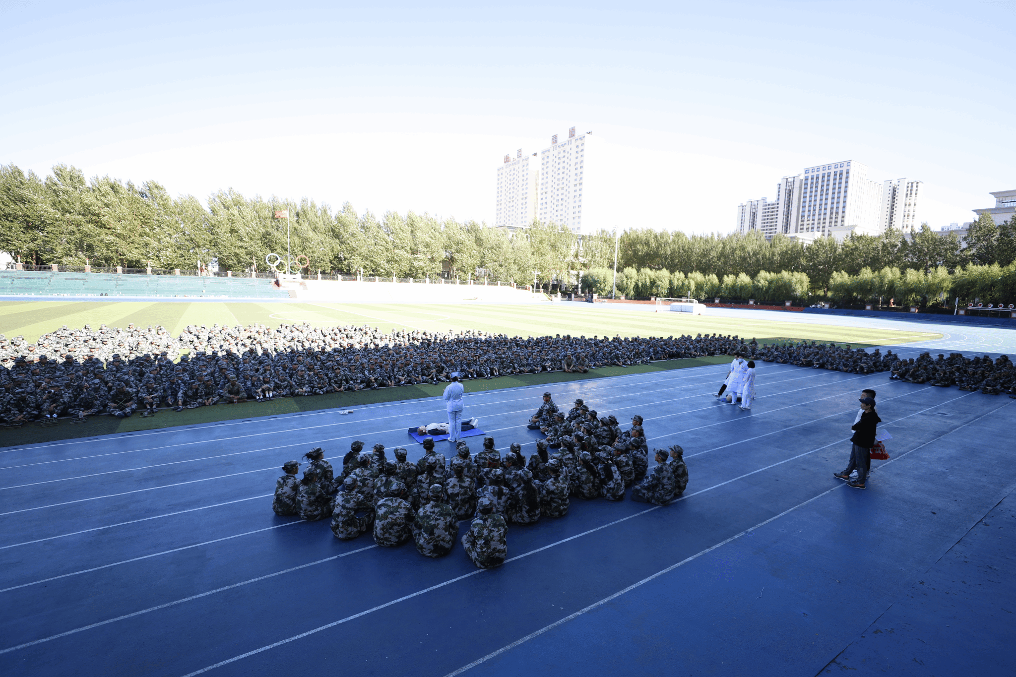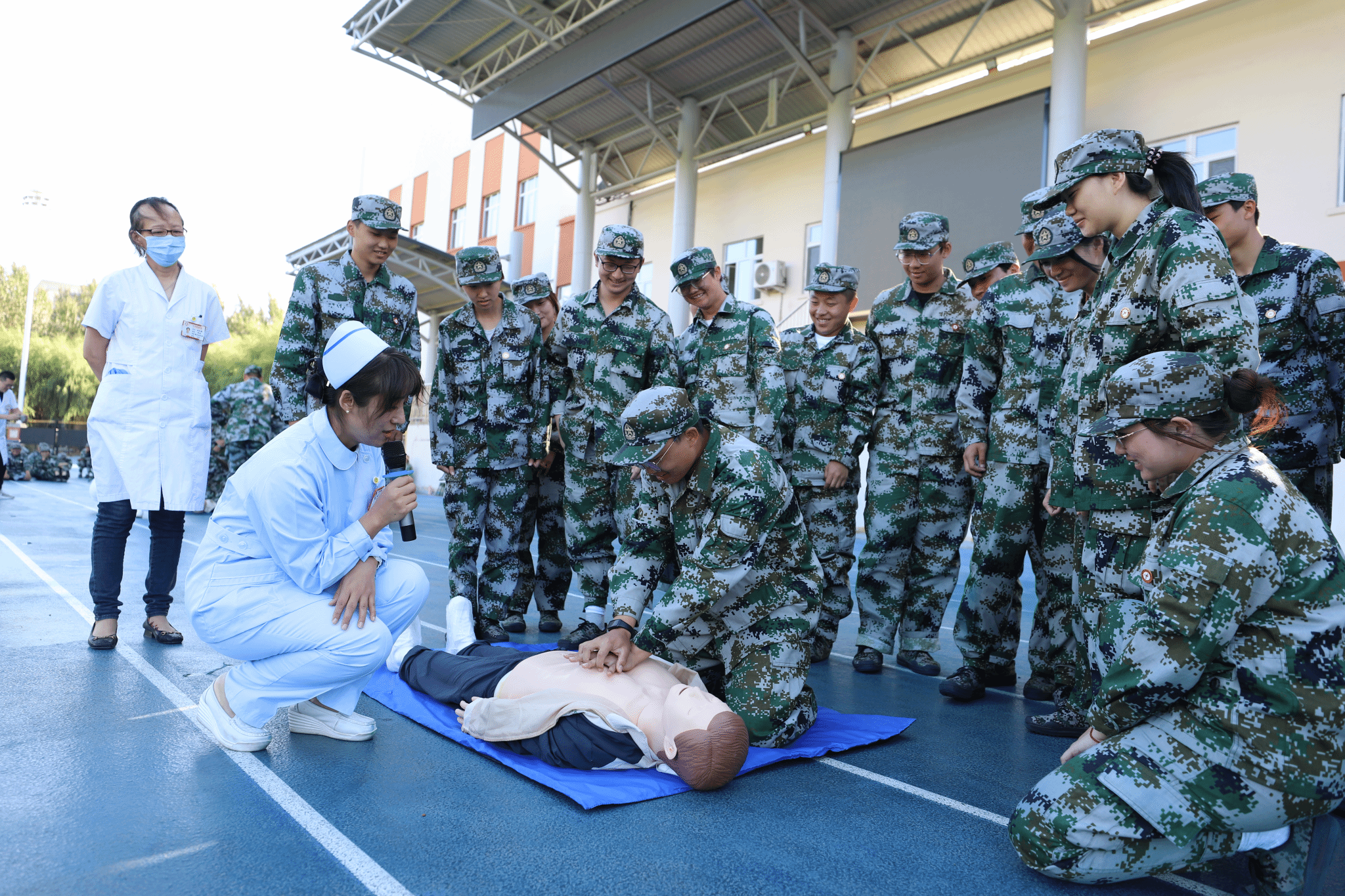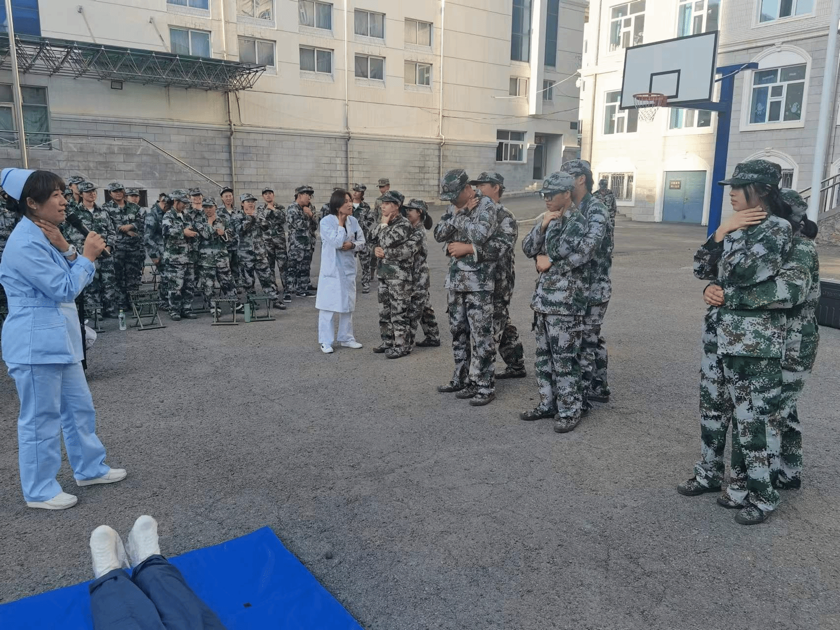 (文/卢涛)为提高新生自我保护能力、掌握必要的急救知识,9月14日下午,我校特邀黑龙江省医院医疗团队在主校区、艺术与设计校区、经济管理校区新生军训训练场地举办应急医疗救护知识讲座。讲座由黑龙江省医院护理教研室副主任护师马静主讲,黑龙江省医院对外联络部干事蒋蕊、衣红梅、李艳珠、杨爽演示,学生处(武装部)学生管理科科长卢涛主持。