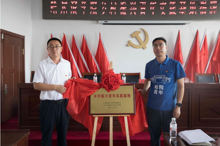 学校团委书记路今钊、水泉乡党委书记张靖飞共同为“乡村振兴青年实践基地”揭牌