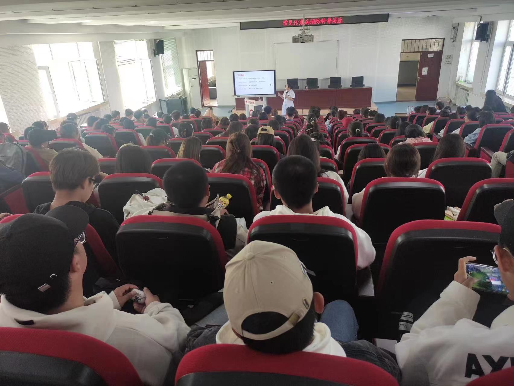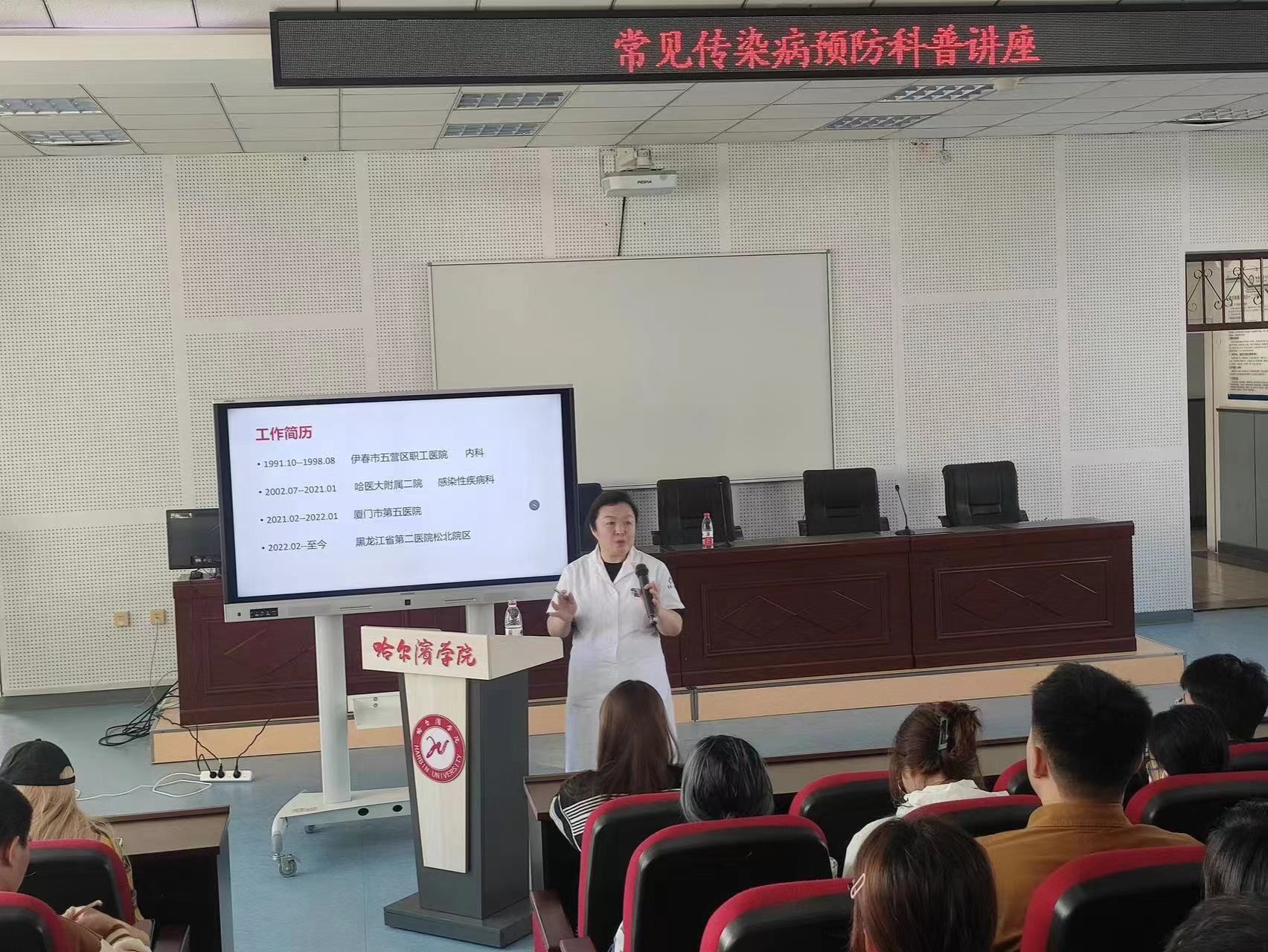 在3号楼阶梯教室,后勤管理处卫生所聘请黑龙江省第二医院感染科吴霞主任为师生进行“流感、结核、艾滋、诺如、水痘”等传染病预防宣讲教育,吴主任以感染的概念开场,凭借丰富的临床经验,列举大量病例的方式,宣讲了如下几项内容: 1.传染性疾病感染的临床特征,如发热、皮疹;2.管理传染源;3.切断传播途径,如呼吸道传播、血液体液传播、消化道传播、母婴垂直传播;4.几种传播途径代表疾病的认识和预防;5.常见传染病的治疗:明确病原学,抗炎或抗病毒治疗;6.近两年新出现的传染病,猴痘的概念和预防;7.传染病的个人防护及消毒知识,勤洗手,正确佩戴口罩,保持良好卫生习惯,教室、寝室勤通风,加强体育锻炼,增强体质,青年学生是能够预防大部分常见传染病的。