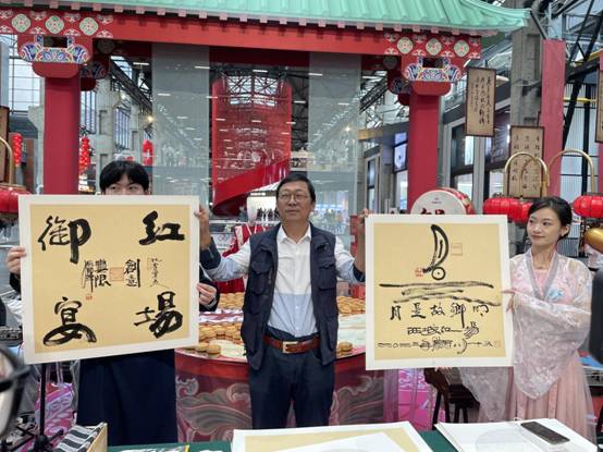 活动现场,艺术与设计学院的学生们身穿汉服赴宴,尽显古韵;美食佳音,现场氛围十分热闹。孙国辉书记书亲笔书写精美作品,通过小游戏赠予大家,并提笔“红场御宴,创意无限”、“月是故乡明”等内容,祝愿大家节日快乐。