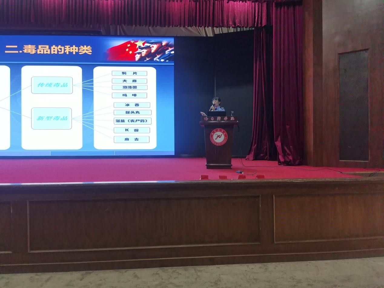 宋媛老师以“珍爱生命·远离毒品”为主题,针对当前禁毒新态势,科学阐释毒品概念,介绍了传统毒品和新型毒品的种类、毒品的危害、毒品侵害典型案例、禁毒相关法律法规,特别是诸如“笑气”、依托咪酯等未列管成瘾物质替代滥用等新情况,深刻揭示毒品危害性、伪装性和迷惑性,广泛传播毒品预防知识和防毒技能,为同学们带来了一场精彩的讲座。讲座中,有学生登台在宋媛老师带领下现场禁毒宣誓,喊出了“……将积极投身禁毒事业行列,从现在做起,从我做起,抵制毒品,参加禁毒,珍爱生命,远离毒品,做到毒品一日不绝,行动一日不止”的铮铮誓言。讲座后,同学们参观禁毒所同志带来的各类展品,对毒品有更直观的认识。