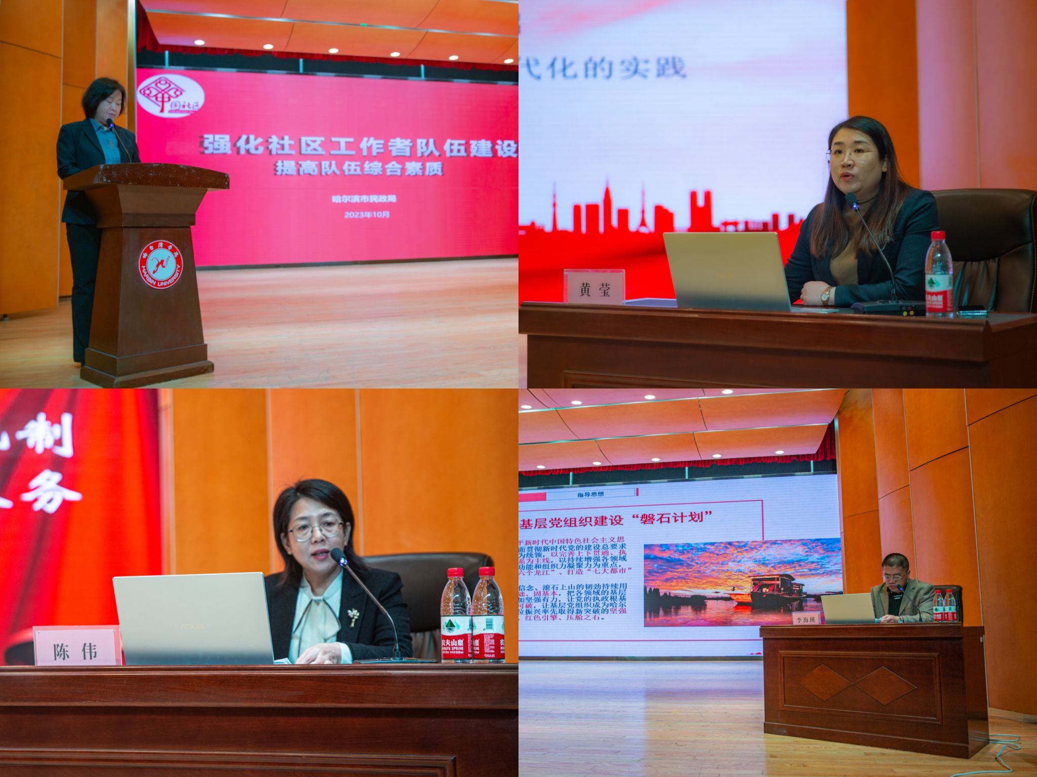 市民政局副局长王春华作动员讲话,阐述了培训评选活动的重要意义;市委组织部组织二处处长李海瑛、市民政局社会救助处处长陈伟就实施基层党建磐石计划、党建引领基层救助作专题报告。民政局基层政权建设和社区治理处处长付炜就强化社区工作者队伍建设,全面提升服务能力做讲解。最后,哈尔滨学院社会工作系主任黄莹为全体学员做了以社会工作实务基础为主要内容的讲座。