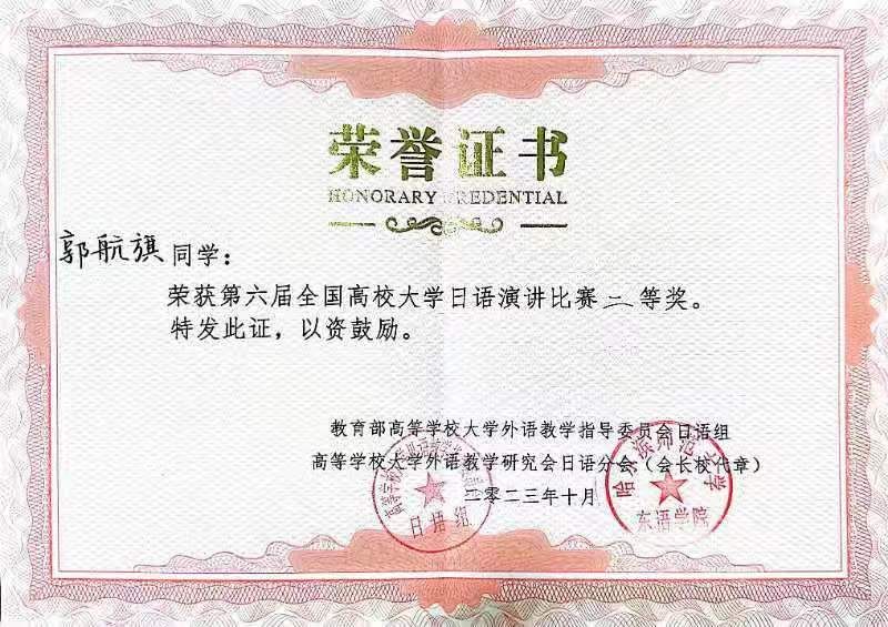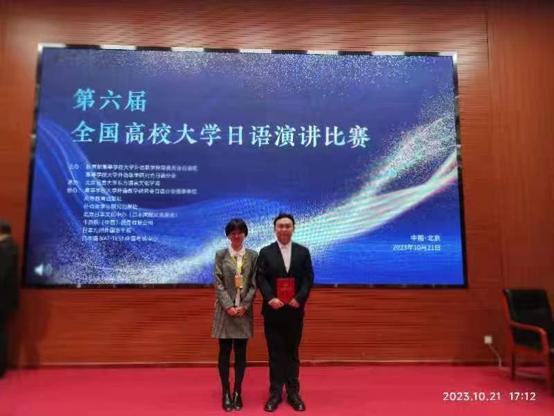(文/崔莉莉)10月21日,由北京语言大学东方语言文化学院承办的第六届全国高校大学日语演讲比赛在北京落下帷幕。经过与来自复旦大学、北京师范大学、大连外国语大学等近百所高校参赛选手的激烈角逐,我校2022级英语专业郭航旗同学在外国语学院教师崔莉莉指导下,凭借扎实的日语知识,娴熟的演讲技巧及良好的赛场表现,在众多选手中脱颖而出,最终斩获全国二等奖。这是我校学子首次参加此项赛事并获得佳绩,实现了历史性突破。