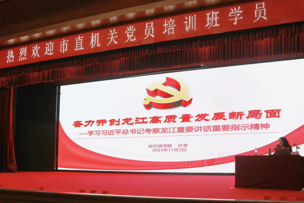 孙芳以《学习领会习近平总书记在新时代推动东北全面振兴座谈会上的讲话精神》为题,深度解读了习近平总书记关于实现东北全面振兴、全方位振兴的六个方面要求,并提出要深入学习贯彻习近平总书记重要讲话精神,不断拓展全面振兴的深刻内涵,把握东北振兴的战略地位和历史使命,努力走出一条高质量发展、可持续振兴的新路子,奋力谱写东北全面振兴新篇章。在现场教学环节还组织学员们参观了“黑龙江省优秀精神文创展览馆”。