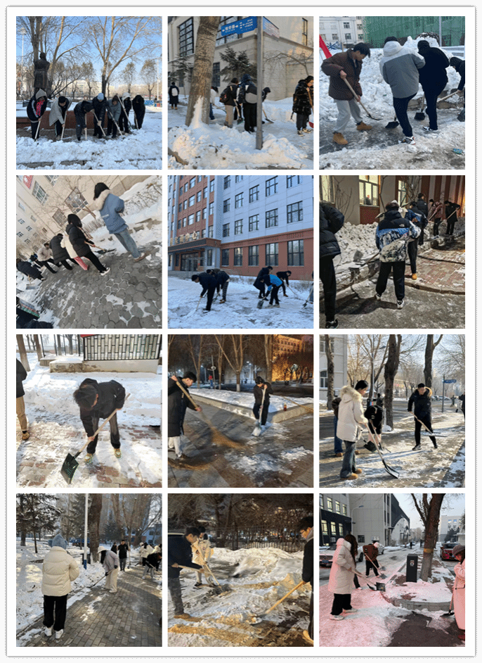 活动中,各学院学生不畏严寒,斗志昂扬,对学校主路人行道、各学生公寓门前积雪、冰面进行清扫,忙碌的身影成为校园中亮丽的风景。通过不懈努力,校园积雪、冰面基本清理完毕,除冰扫雪任务圆满完成。
