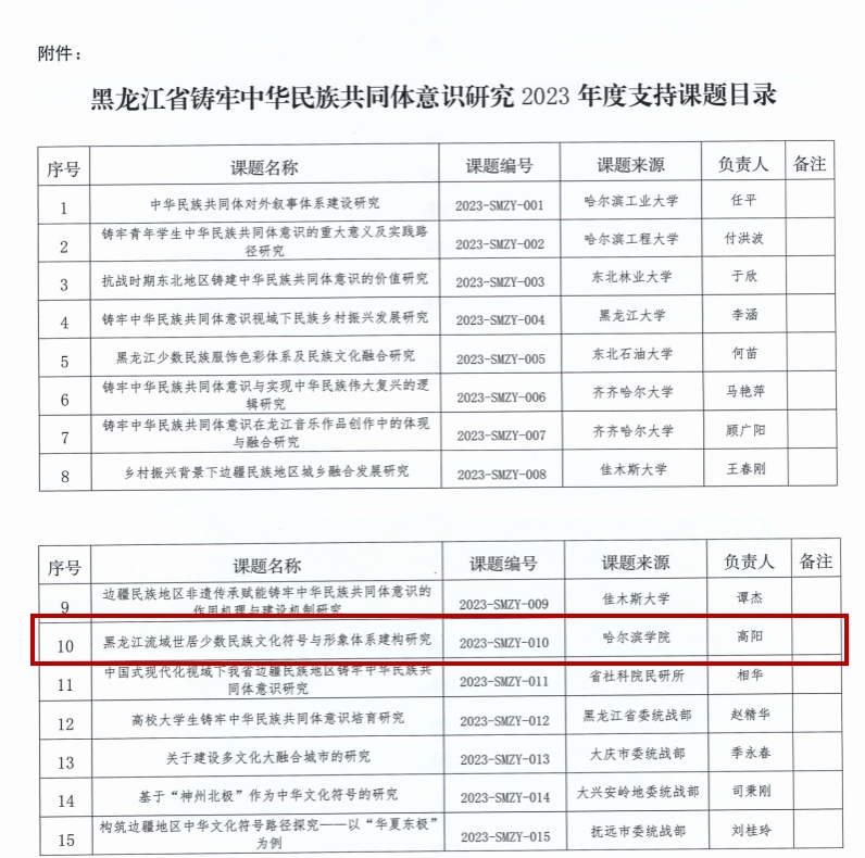 (文/高亮、贾春雷)近日,黑龙江省民族宗教事务委员会发布《关于确定黑龙江省铸牢中华民族共同体意识研究 2023 年度支持课题的通知》。我校艺术与设计学院高阳副教授主持的研究课题《黑龙江流域世居少数民族文化符号与形象体系构建研究》成功入选。这一成果标志着我校在铸牢中华民族共同体意识研究领域迈出了重要一步。