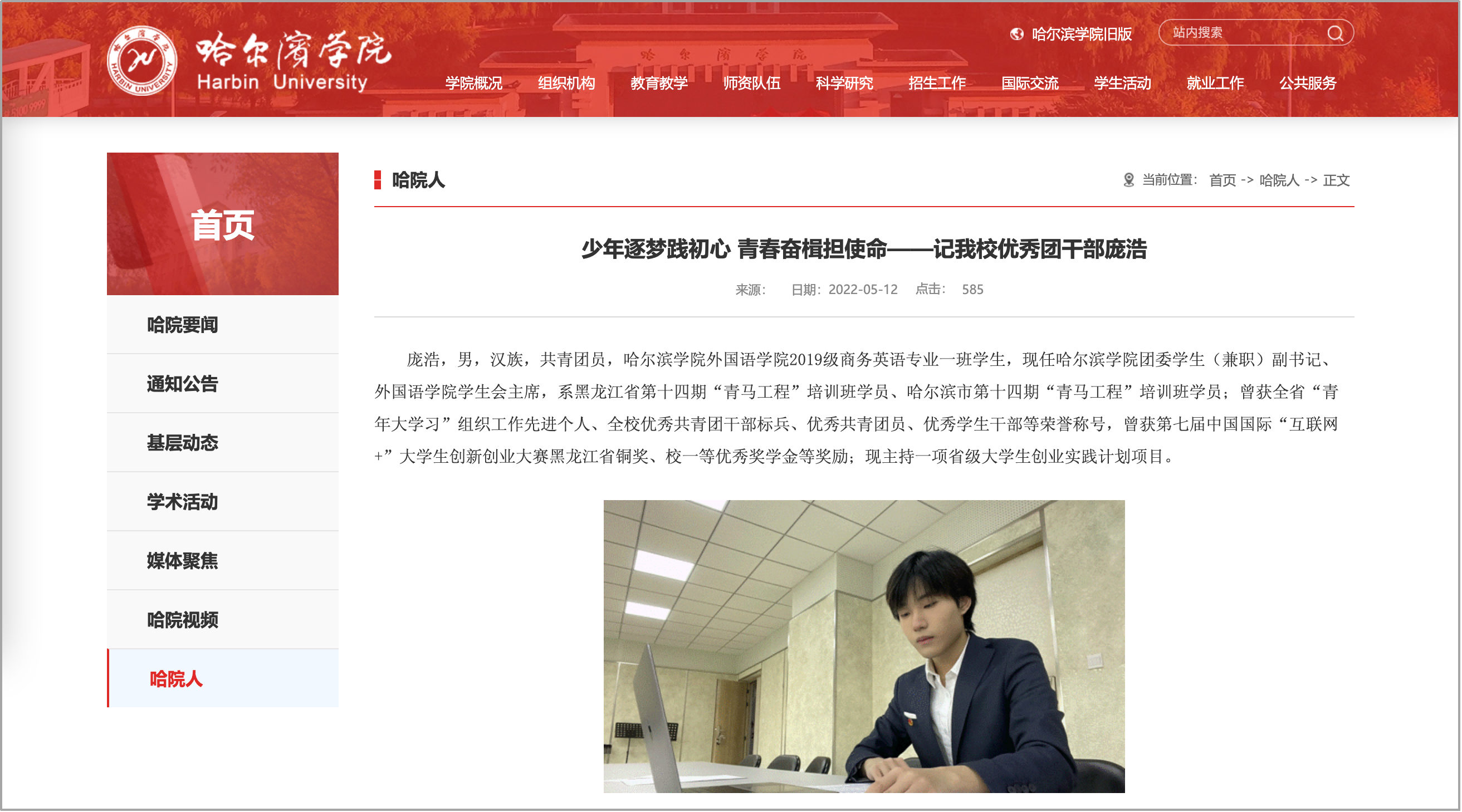2022年5月12日,学校党委宣传部在校园网“哈院人”专栏报道我校优秀共青团干部标兵庞浩同学。时逢全校“两先两优”表彰。(http://www.hrbu.edu.cn/info/1077/16188.htm)