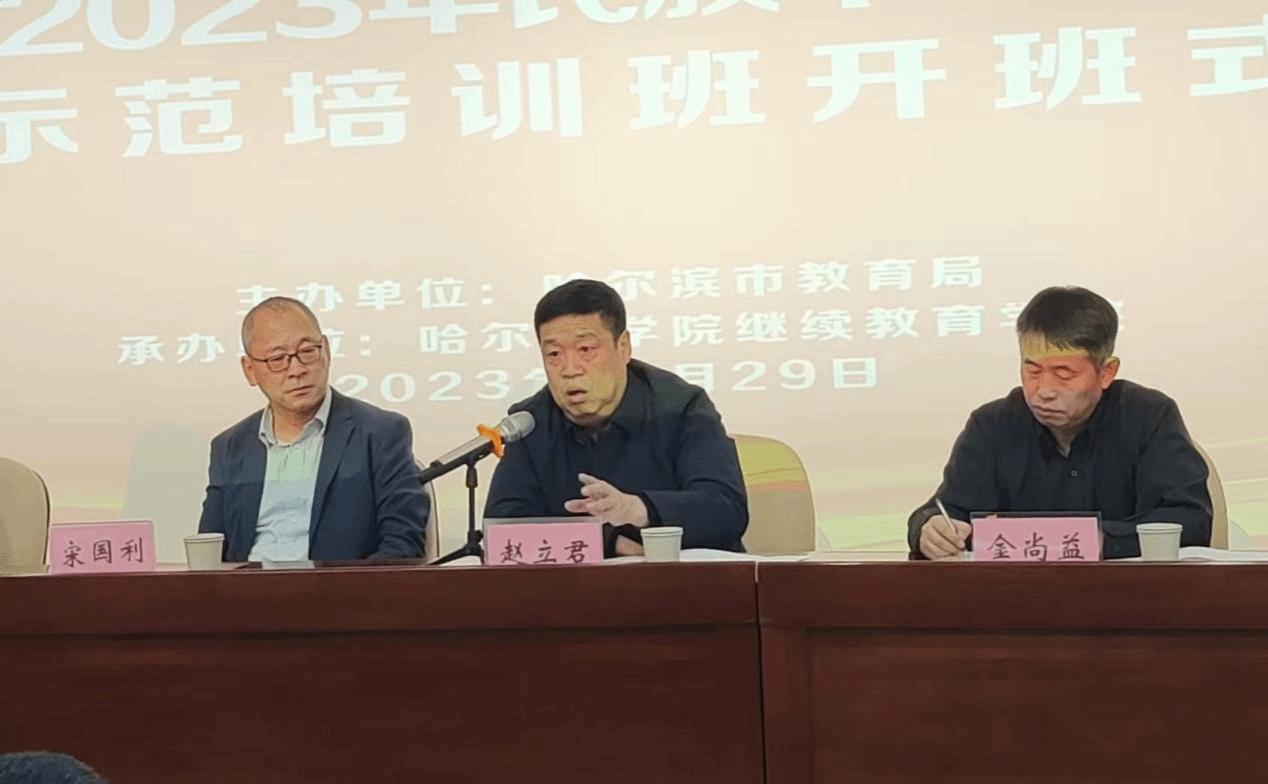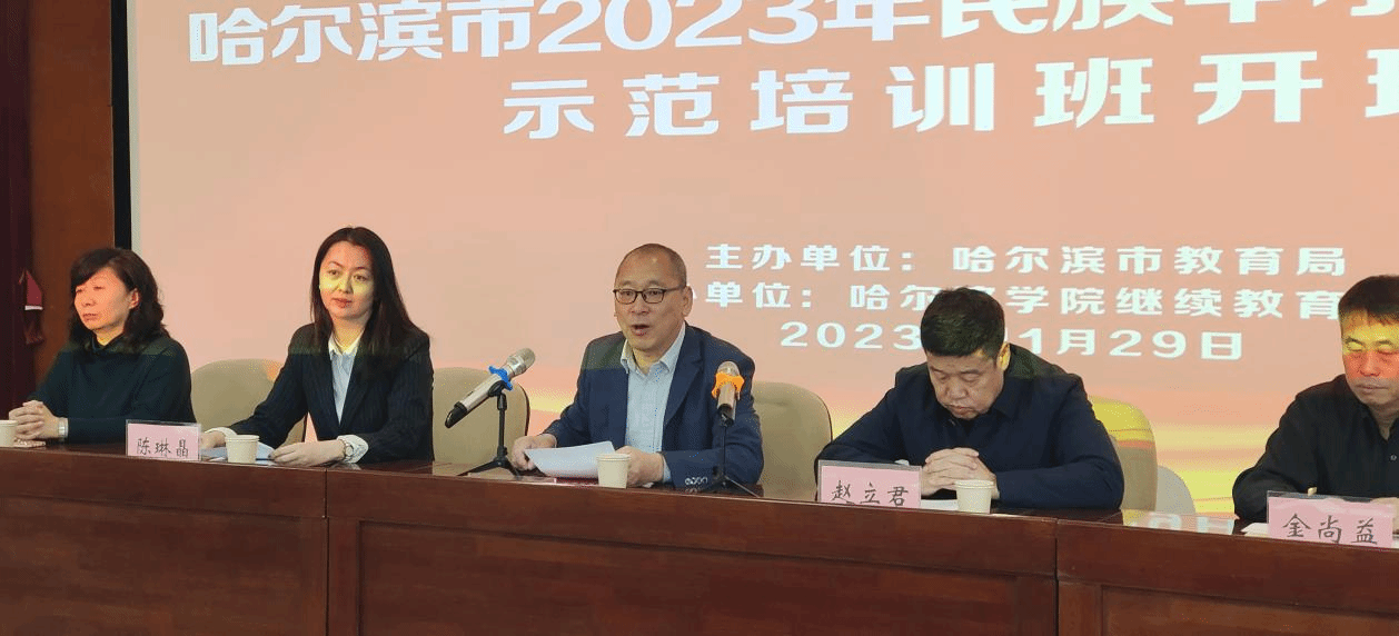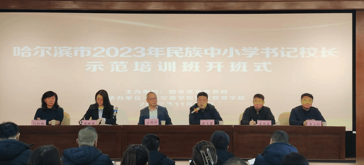 (文/郝哲源)11月29日,由哈尔滨市教育局主办,哈尔滨学院继续教育学院承办的“哈尔滨市2023年民族中小学书记校长示范培训班”开班式在哈尔滨学院举行。哈尔滨市教育局副局长赵立君、义务教育处处长陈琳晶、三级调研员刘红梅,哈尔滨市教育研究院民族教研部主任金尚益,我校副校长宋国利、继续教育学院院长吴立刚。来自哈尔滨市九区九县38名民族中小学书记、校长及管理人员参加培训。