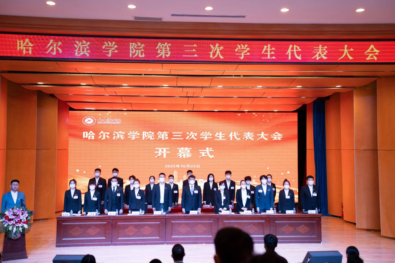 (文/顾相君)2022年10月23日上午9时,在高亢嘹亮的国歌声中,哈尔滨学院第三次学生代表大会在音乐与舞蹈学院音乐厅隆重召开。学校党委委员、副校长吴旭峰、哈尔滨市学联驻会主席刘雪薇、学生处副处长张强、团委负责人张玉娟出席大会开幕式。开幕式由校团委副书记(挂职)顾相君主持,各学院分团委书记、179名正式代表、90名列席代表及相关团务工作者,共计300余人通过线上与线下相结合的方式参会。