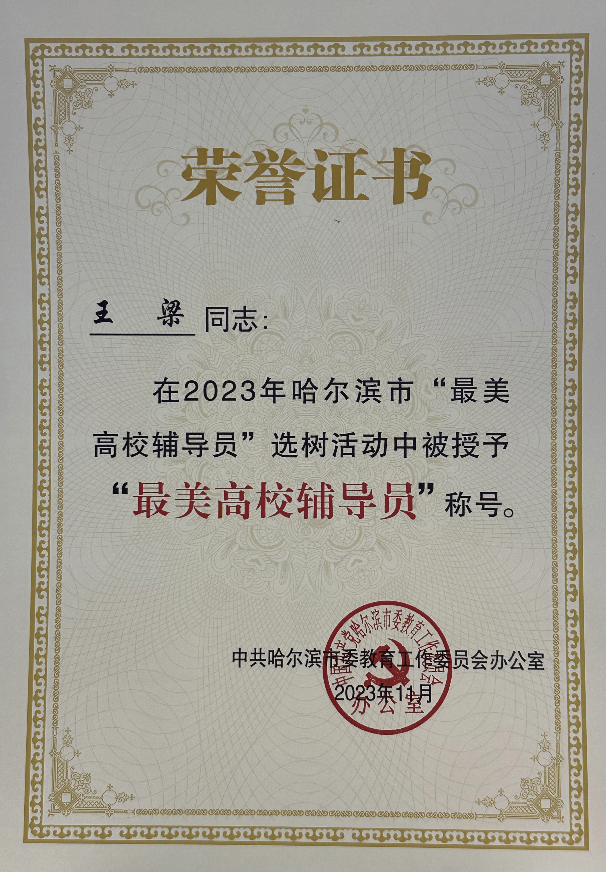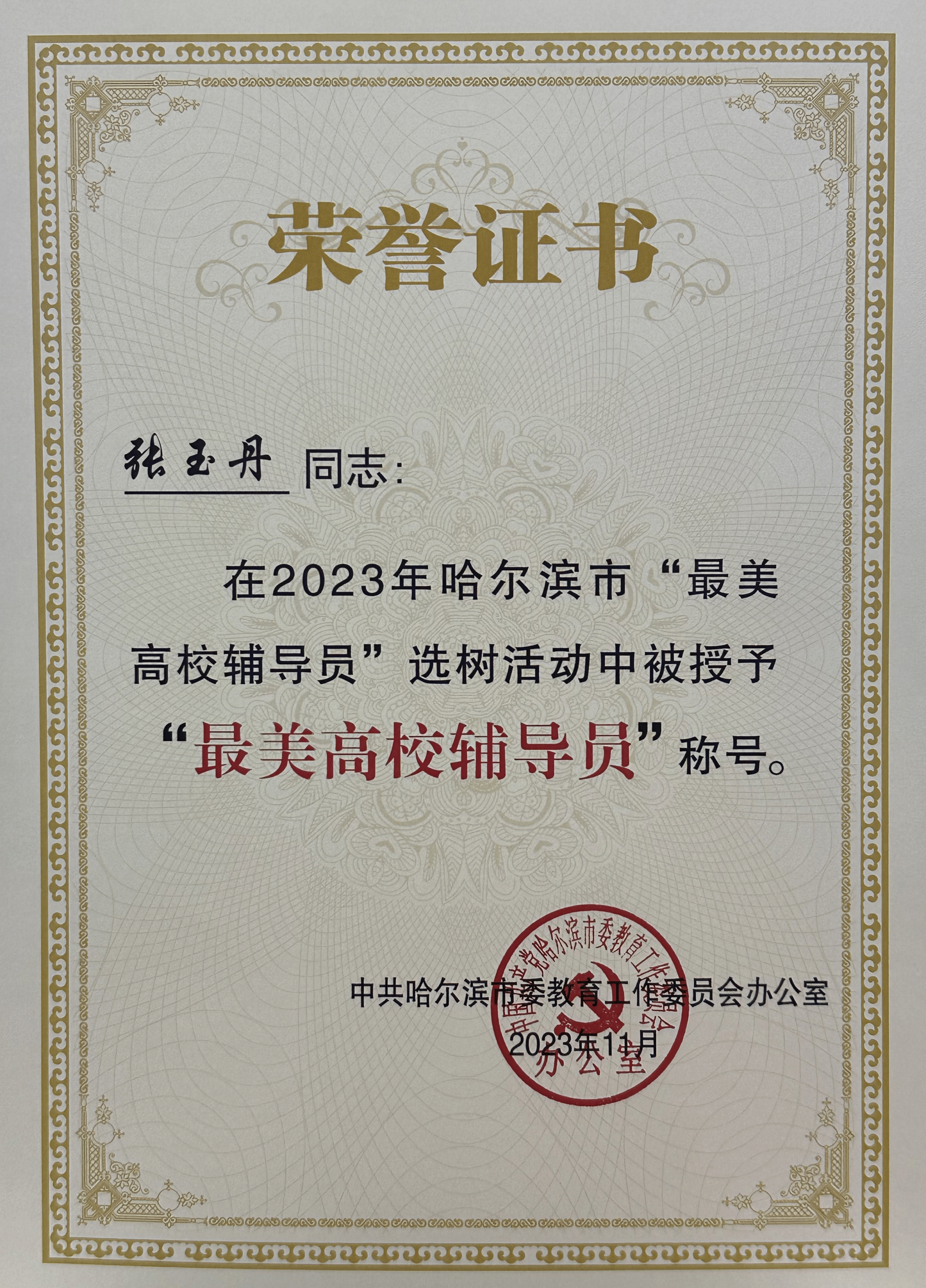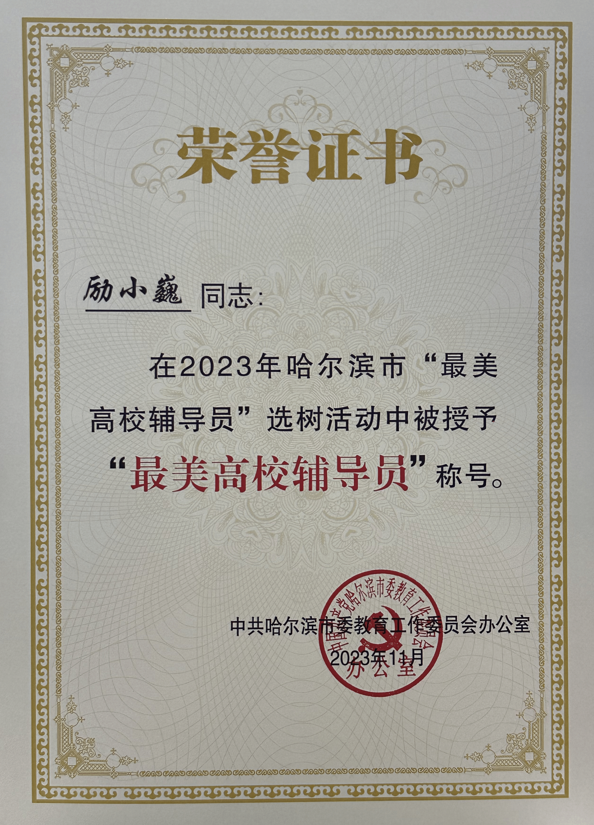 (文/张强)近日,由中共哈尔滨市委教育工作委员会主办的2023年哈尔滨市“最美高校辅导员”选树活动落下帷幕,经过学校推荐、资格审核、通讯评审等环节,我校信息工程学院辅导员励小巍、音乐与舞蹈学院辅导员王梁、体育学院辅导员张玉丹荣获2023年哈尔滨市“最美高校辅导员”荣誉称号。