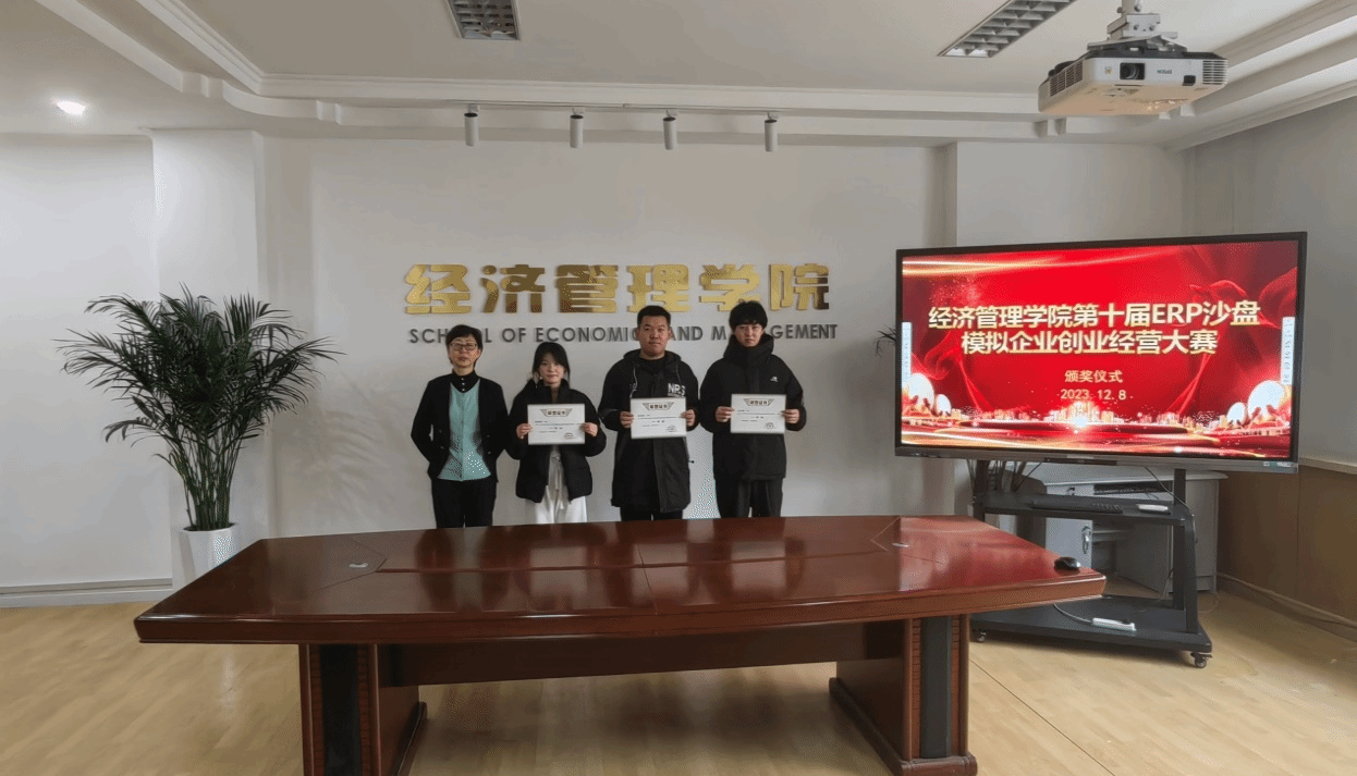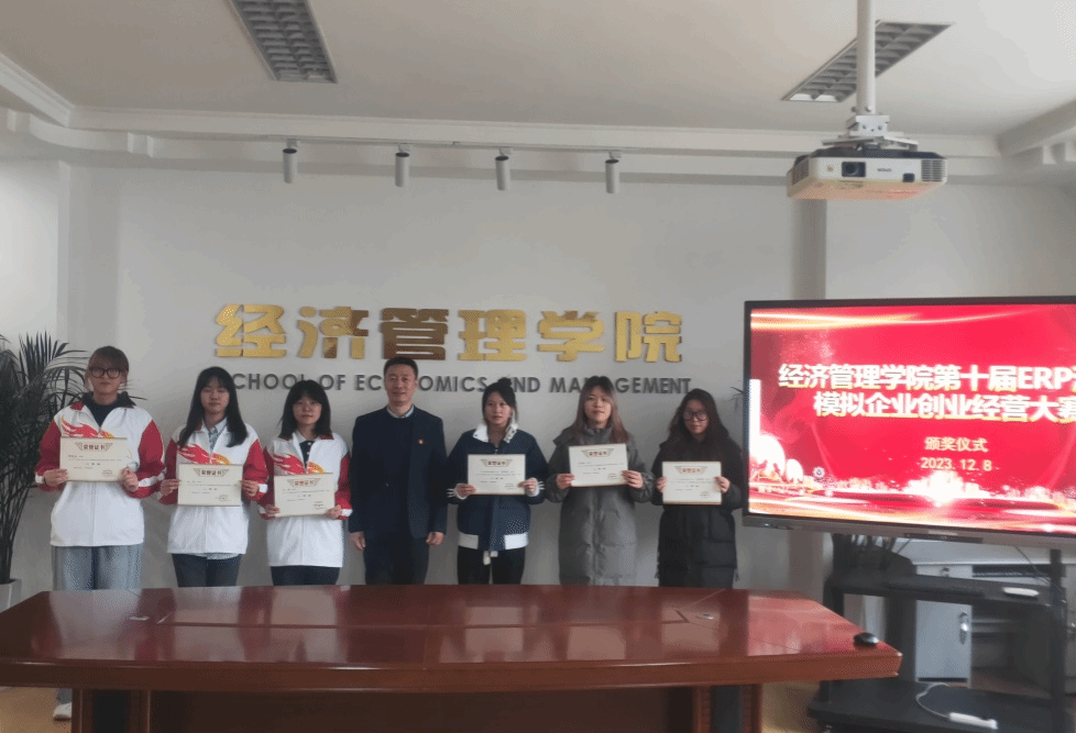 依托ERP沙盘社团对参赛选手进行了近二个多月的赛前培训,12月6日,大赛经历了近7个小时的激烈角逐后比赛圆满结束。12月8日中午,在小会议室举行了颁奖仪式,经济管理学院党委书记孙亮、院长许淑琴、副院长程宇分别为获将选手颁发了获奖证书。