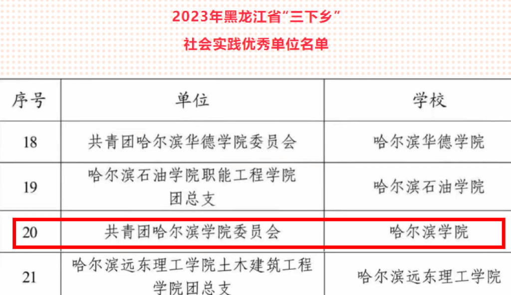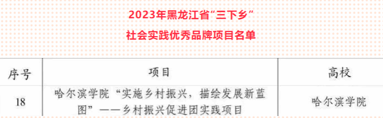 (文/李一宁)选树优秀典型、发挥育人实效。近日,团省委、省学联组织开展了2023年黑龙江省大中专学生志愿者暑期文化科技卫生“三下乡”社会实践活动总结工作。经基层申报、资格审核、组织评议等环节,哈尔滨市各高校共获得12项荣誉,我校荣获“优秀社会实践优秀单位”及“社会实践优秀品牌项目称号。