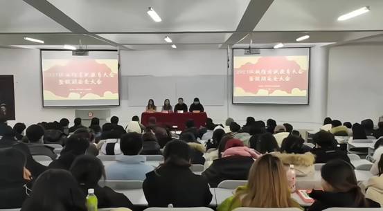 (文/赵健)为提高学生诚信考试意识和假期安全防范意识。12月18日中午, 在4331教室召开诚信考试动员大会暨假期安全教育大会。艺术与设计学院副处级辅导员郭鹏程、学工办主任赵健、辅导员戴佳宝、童晨、2023级全体同学、2022级、2021级班级委员参加了本次会议。
