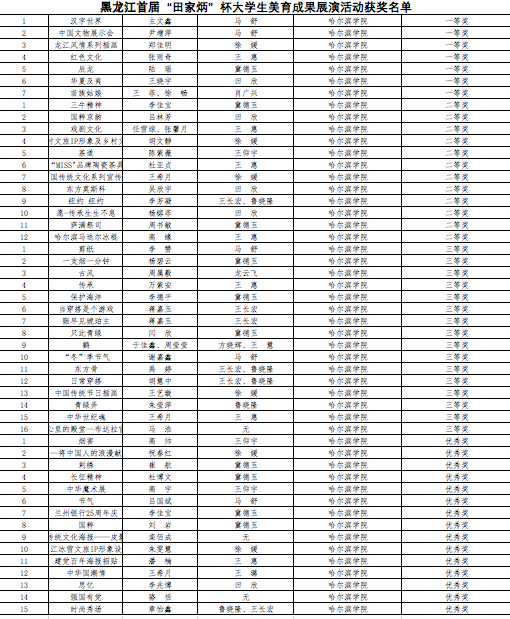 (文/鲁晓隆)2022年11月3日黑龙江省教育厅官方网站公示了黑龙江省首届“田家炳”杯大学生美育成果展演活动获奖名单。哈尔滨学院艺术与设计学院共50件作品获奖,一等奖7件、二等奖12件、三等奖16件、优秀奖15件。9位教师荣获优秀指导教师奖。