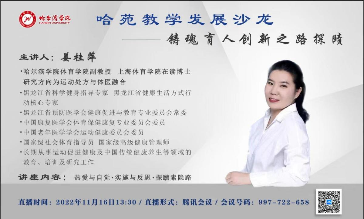 (文/李世超)近日,体育学院副教授姜桂萍老师受邀教师教学发展中心,主持第四十三期“哈苑教学发展沙龙”活动,针对新入职教师和全校中青年教师做了“铸魂育人创新之路探赜”主题讲座。讲座吸引了全校两百多人在线学习。