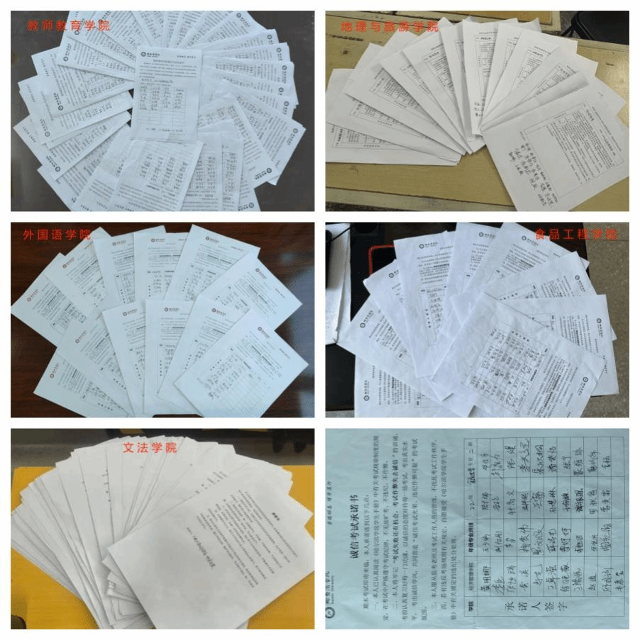 各二级学院以《诚信考试承诺书》为教育渠道和载体,组织全体学生认真学习承诺事项,并以班级为单位在承诺书上集体签名,以此动员和号召同学们勇于承诺、敢于践诺的诚信品格;经济管理学院、地理旅游学院、外国语学院、马克思主义学院、教师教育学院自主申报“诚信考场”,引导学生将“要我诚信”转变为“我要诚信”,强化学生诚信意识,树立诚信观念,打造诚信品牌。《诚信考试承诺书》和“诚信考场”在班级同学之间建立起团结共勉的诚信契约,激发了大家共同坚守诚信底线的责任感和使命感,唤醒了同学们注重诚信的意识和规范品行的自律,更是学生向自己承诺,向优良品格承诺,向学风建设承诺的集中表达。