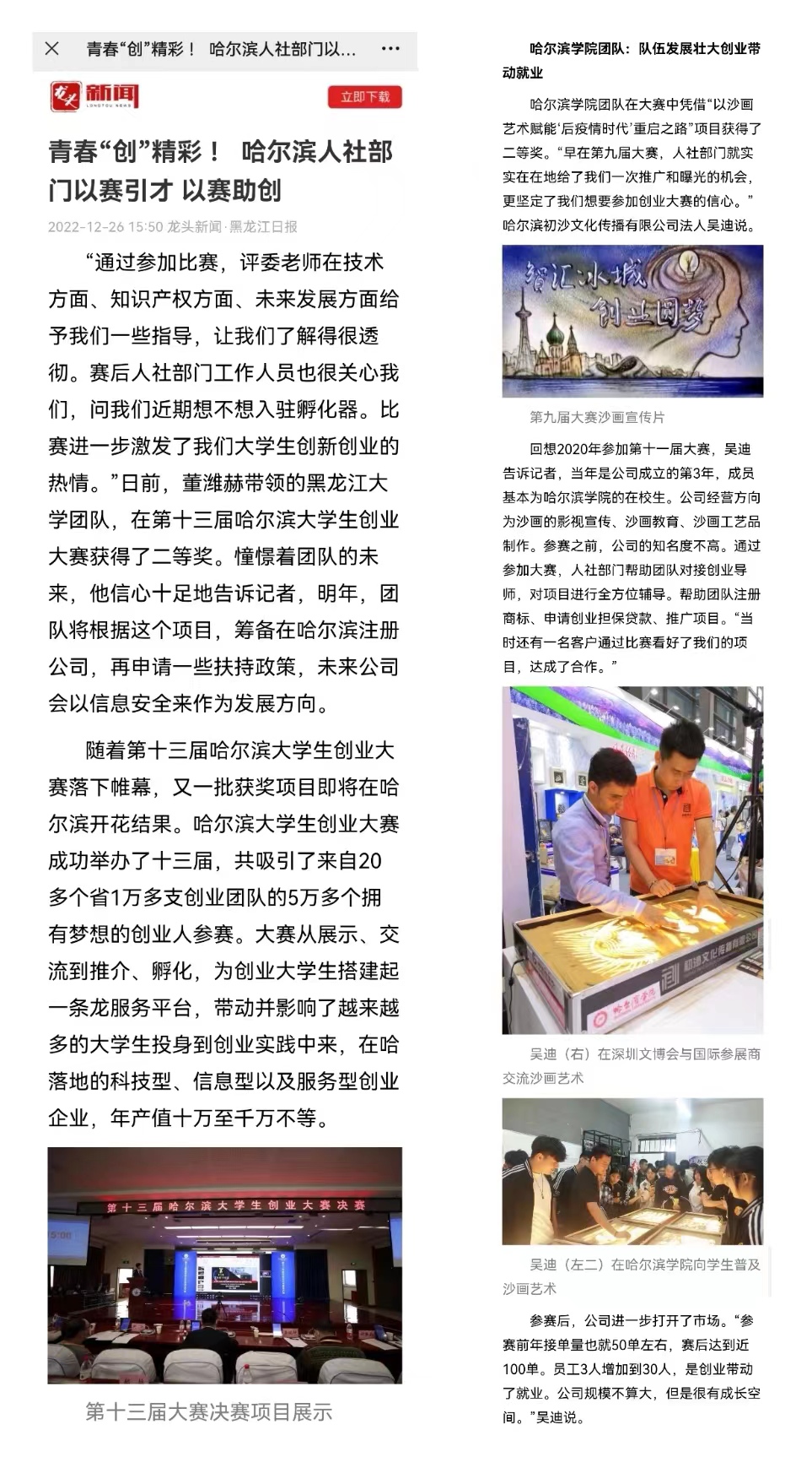 报道指出,“哈尔滨初沙文化传播公司,由哈尔滨学院2016届艺术设计专业学生吴迪创办。该创业项目实现了创意设计与文化产业赋能对接,将艺术作品的内涵用沙画形式加以表现,立足于用一捧沙来表现龙江大地特有的风土人情,不但搭建沙文化推广平台取得了经济效益,而且带动了学弟学妹共同创业,扩大了学生就业范围。”