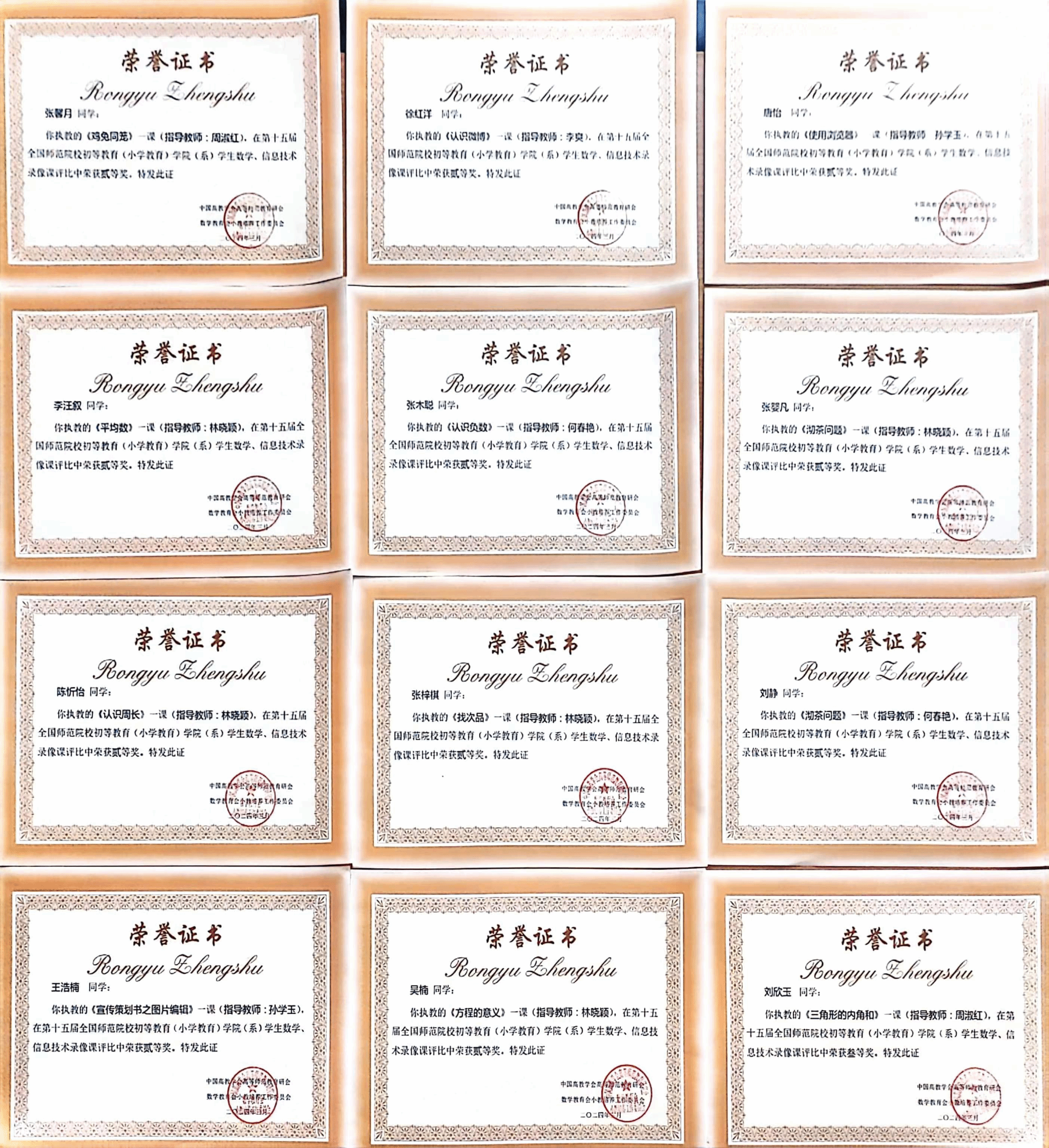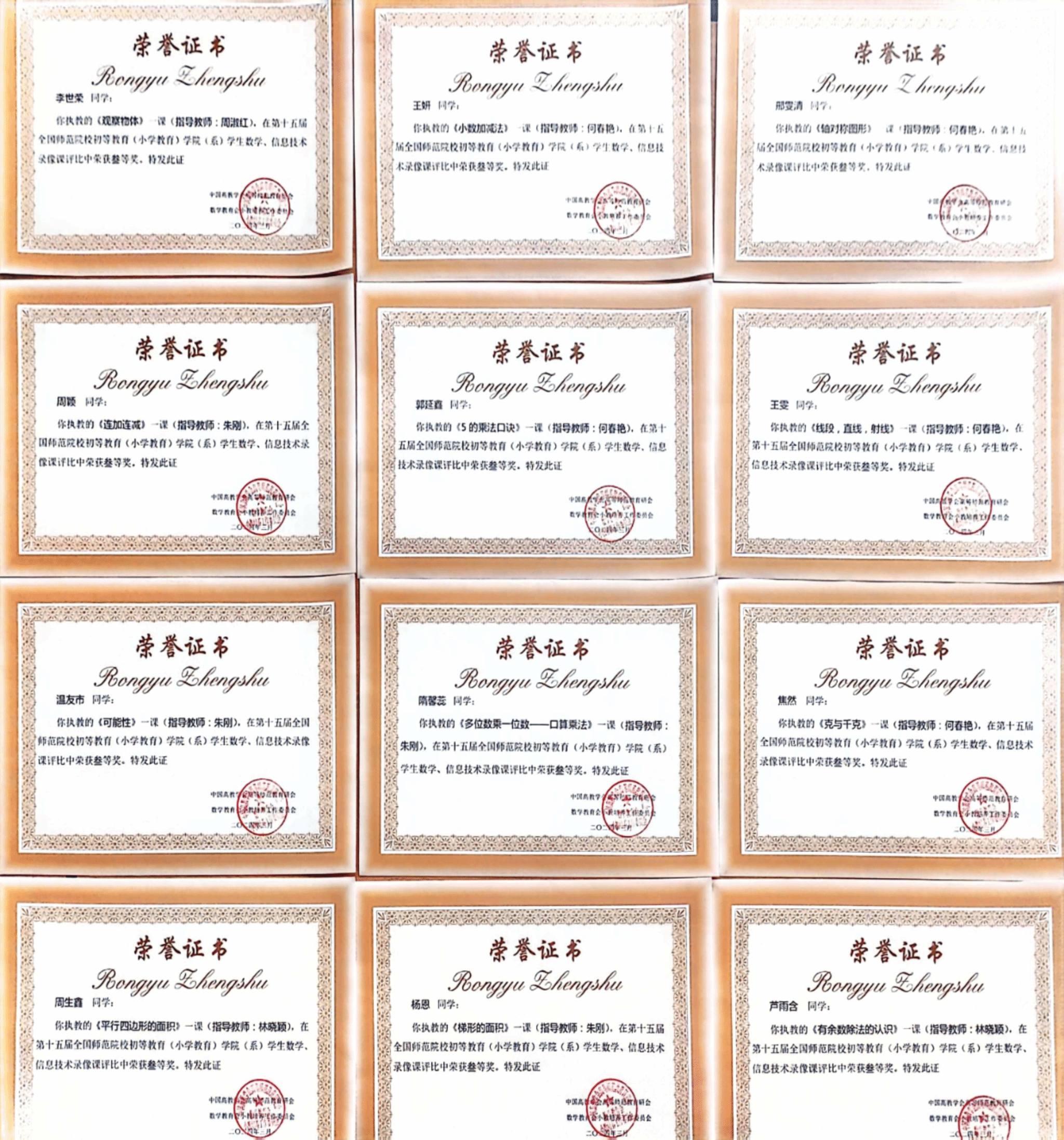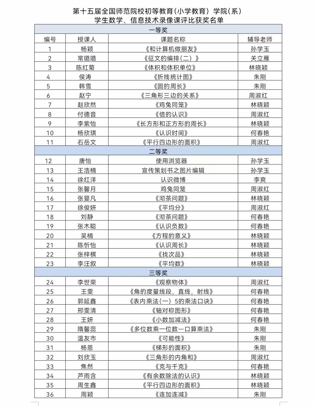 (文/林晓颖)近日,由中国高教学会高等师范教育研究会数学教育会小教培养工作委员会举办的第十五届全国师范院校初教系统学生数学、信息技术录像课评比结果揭晓,我校教师教育学院斩获一等奖11项,二等奖12项,三等奖13项。
