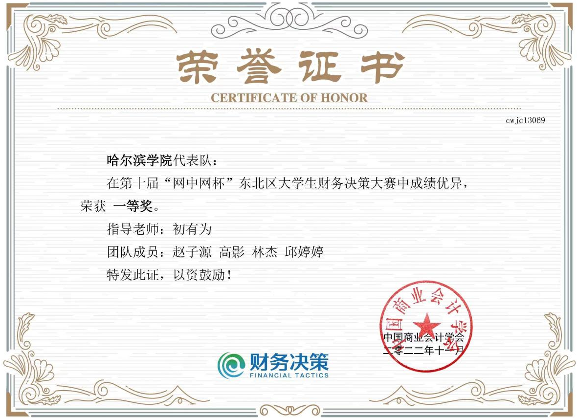 (文/初有为)近日,由中国商业会计学会主办,南京审计大学承办的第十届“网中网杯”全国大学生财务决策大赛系列赛落下帷幕,由我校经济管理学院财务管理专业师生组建的哈尔滨学院代表队披荆斩棘,一路过关斩将,最终获得东北大区赛冠军(一等奖)和全国总决赛一等奖的优异成绩。