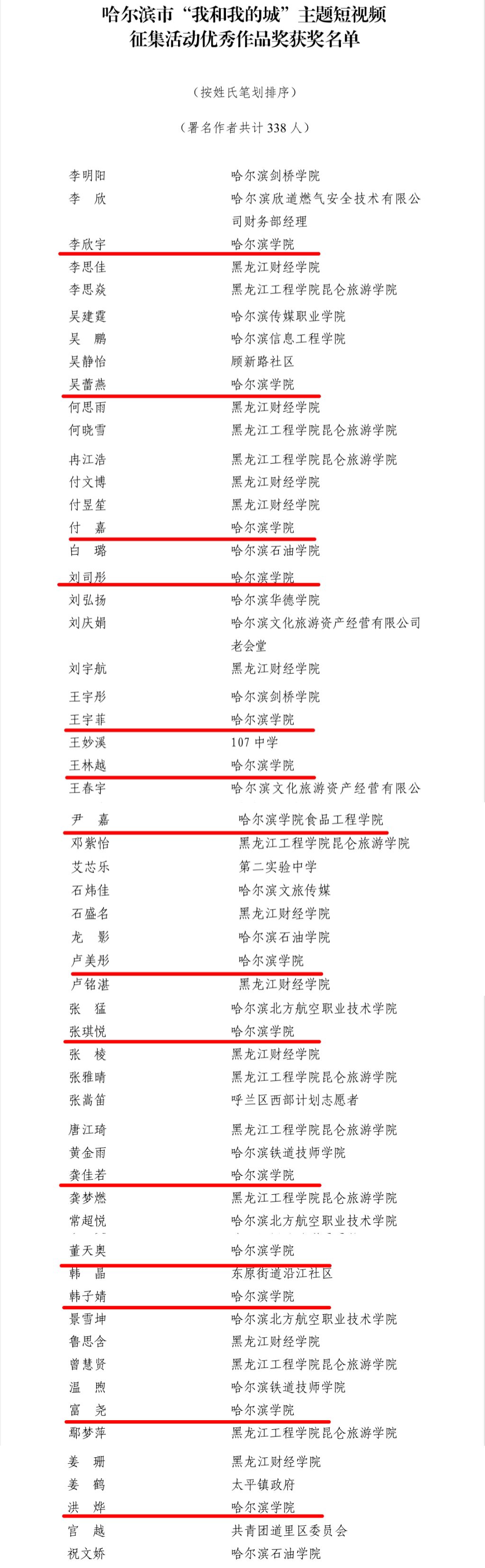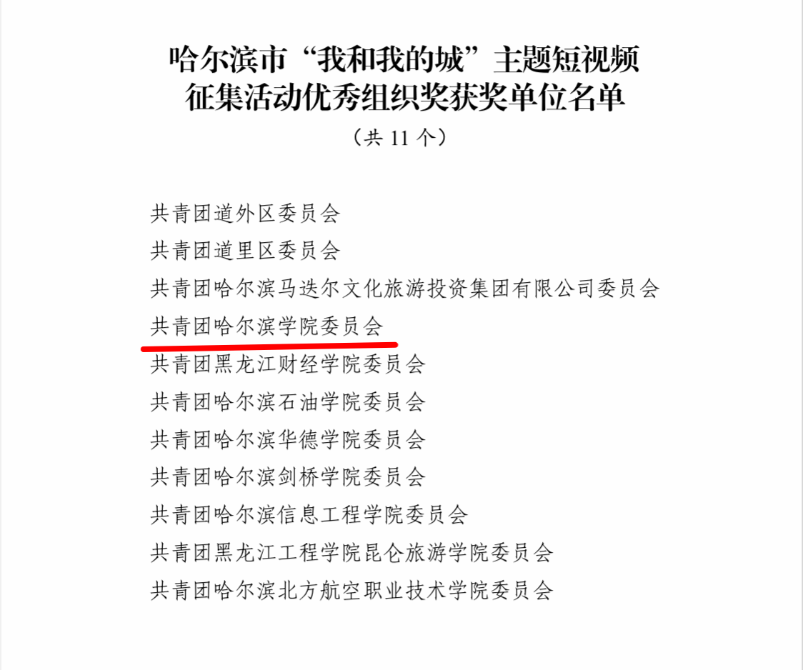 (文/李一宁)近日,由共青团哈尔滨市委员会组织开展的“我和我的城”主题短视频征集活动评选结果揭晓。根据团市委《关于表扬哈尔滨市“我和我的城”主题短视频征集活动获奖组织和作品的通报》文件精神,经评审组评选,团市委审核,我校荣获哈尔滨市“我和我的城”主题短视频征集活动优秀组织单位称号。我校李欣宇等14名同学荣获哈尔滨市“我和我的城”主题短视频征集活动优秀作品奖。