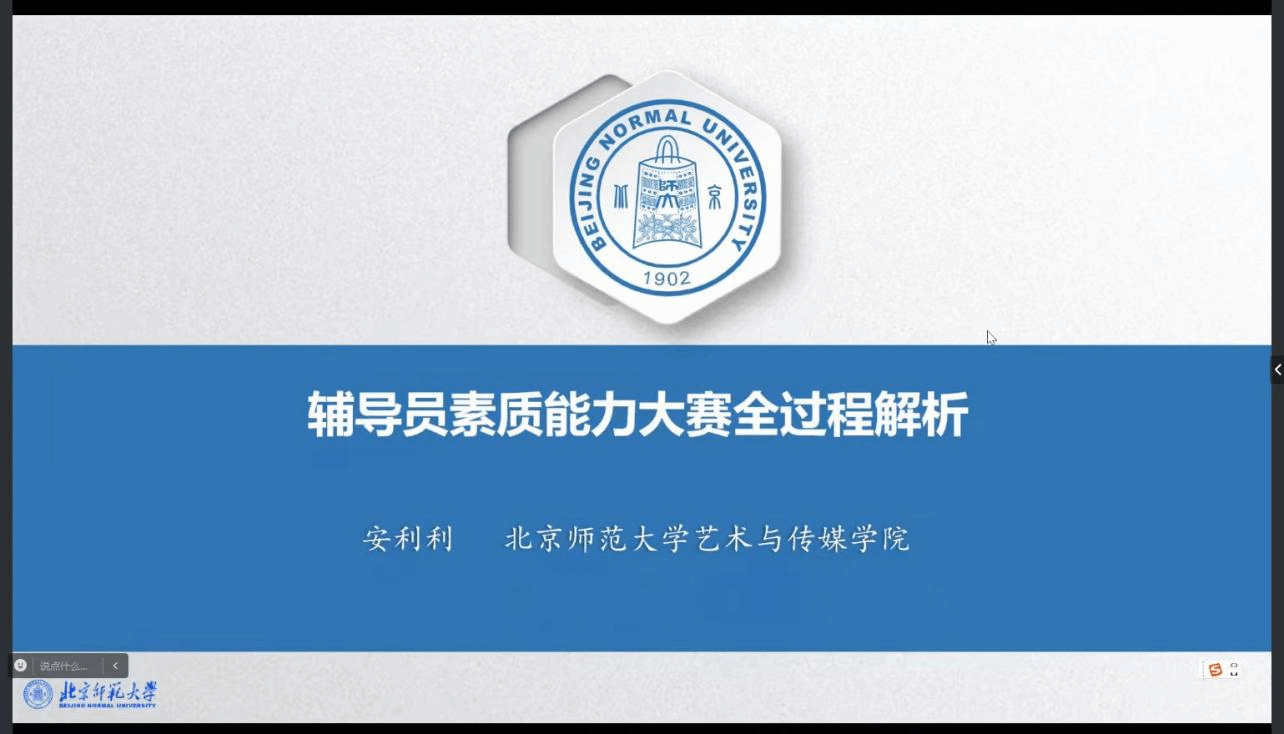 本期沙龙邀请北京师范大学艺术与传媒学院团委书记,曾荣获全国高校辅导员素质能力提升骨干训练营“十佳标兵”(原第九届辅导员素质能力大赛一等奖)、第八届北京高校辅导员素质能力大赛一等奖的安利利老师,做题为“辅导员素质能力大赛全过程解析全方位提升”的专题讲座。安利利老师从“新赛制基本情况介绍”、“新赛制各环节详解”、“走出比赛:辅导员实务启示”三个方面,对辅导员素质能力大赛进行了详细解析,重点讲解了比赛“案例研讨”“谈心谈话”“基础知识测试”三个环节与实际工作之间相互促进、相互提升的实践路径,并就参赛能力提升和丰富答题技巧等方面给出了明确的指导。