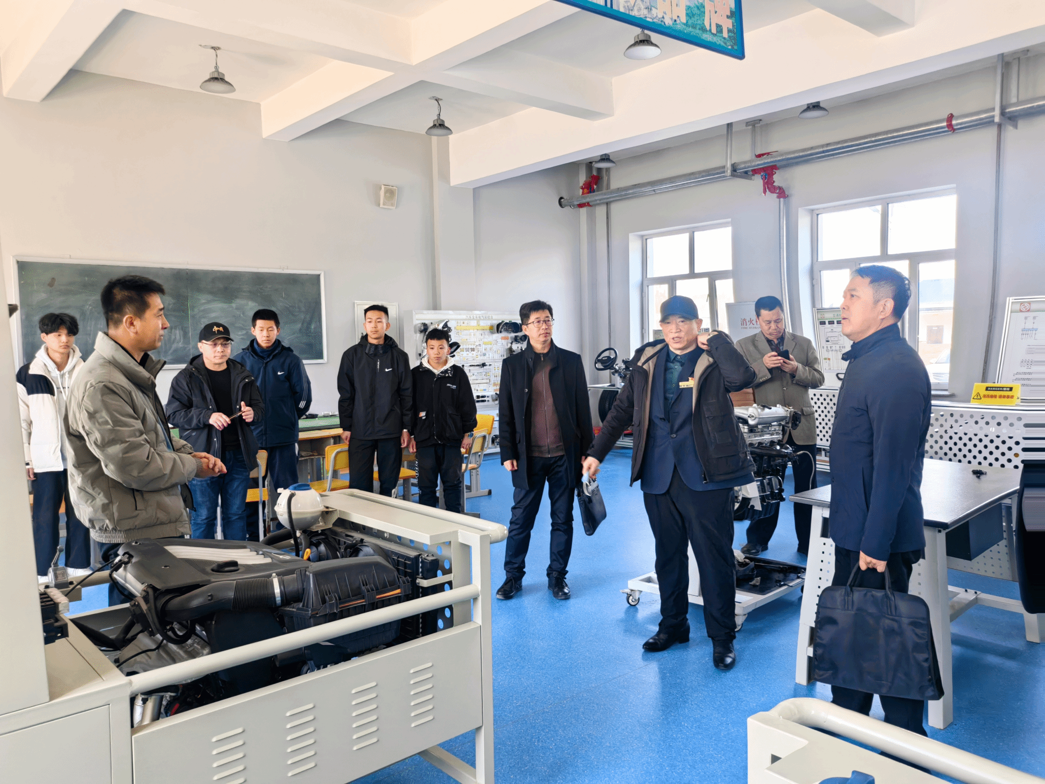 吴立刚一行人先后参观了教学楼、实训楼、新能源汽车实训室、党建活动室、图书室、食堂、学生公寓等。详细了解职教中心在党的建设、校园文化建设、校企合作、学校的发展等方面工作情况。
