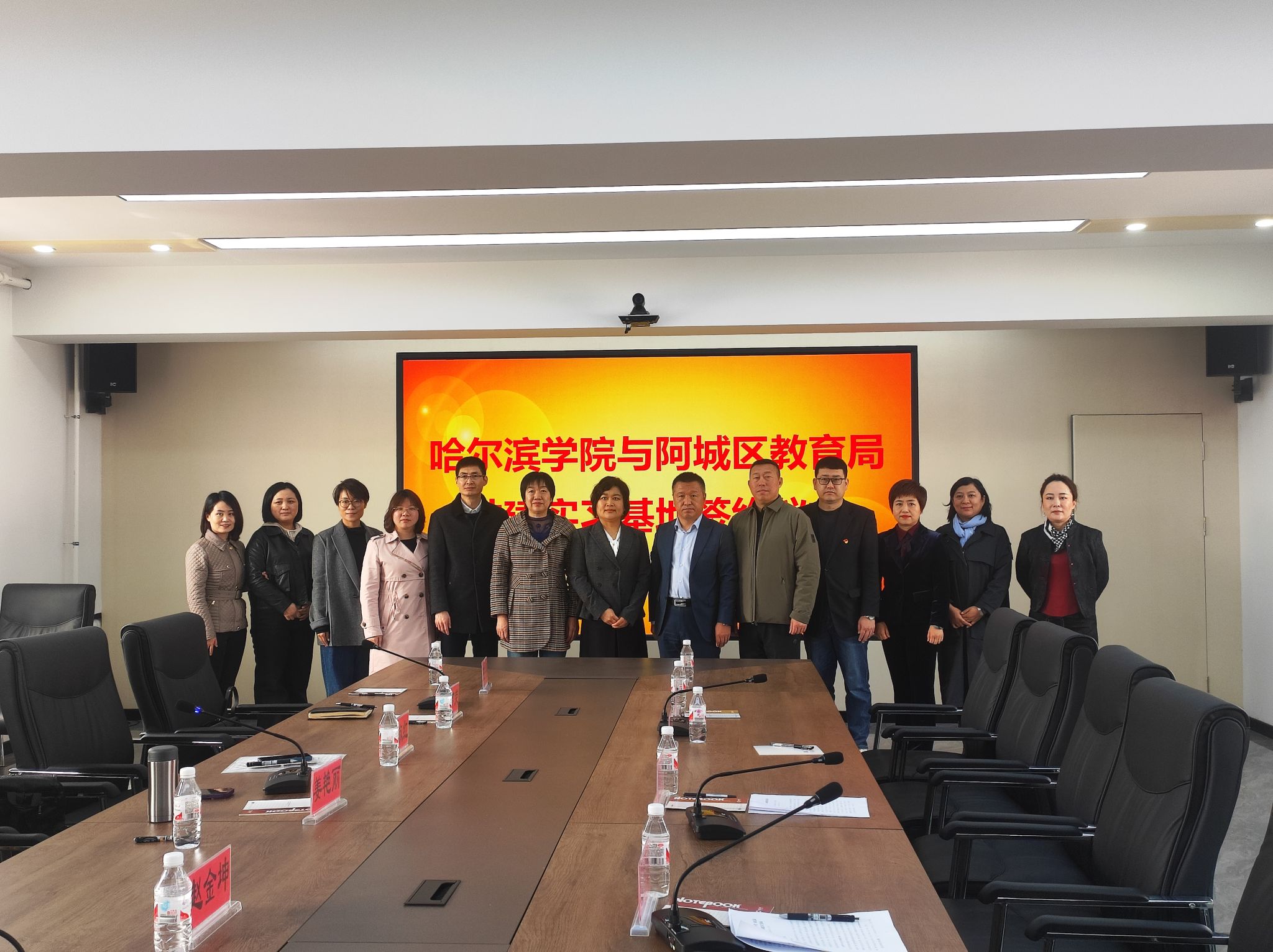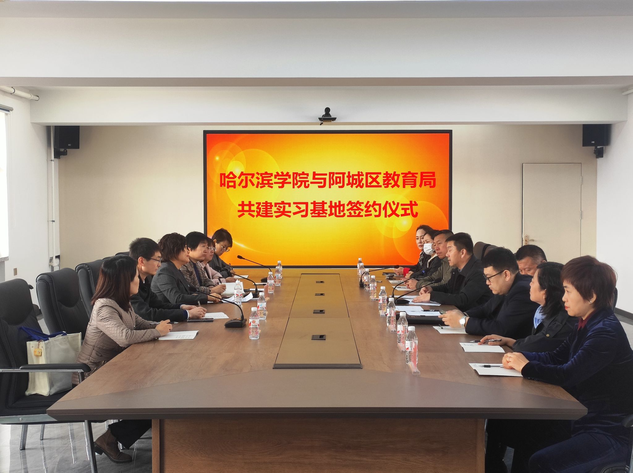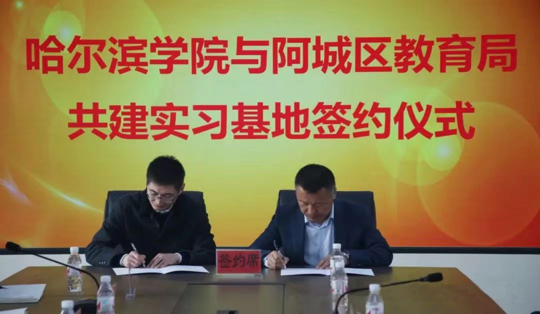 赵金坤与马洪哲分别代表双方签订《共建哈尔滨学院实习就业基地》协议,学校与阿城区教育局在师范生实习、协同育人、共建课程、开拓就业市场等领域建立了长效合作机制,为进一步的密切合作打下了良好的基础。