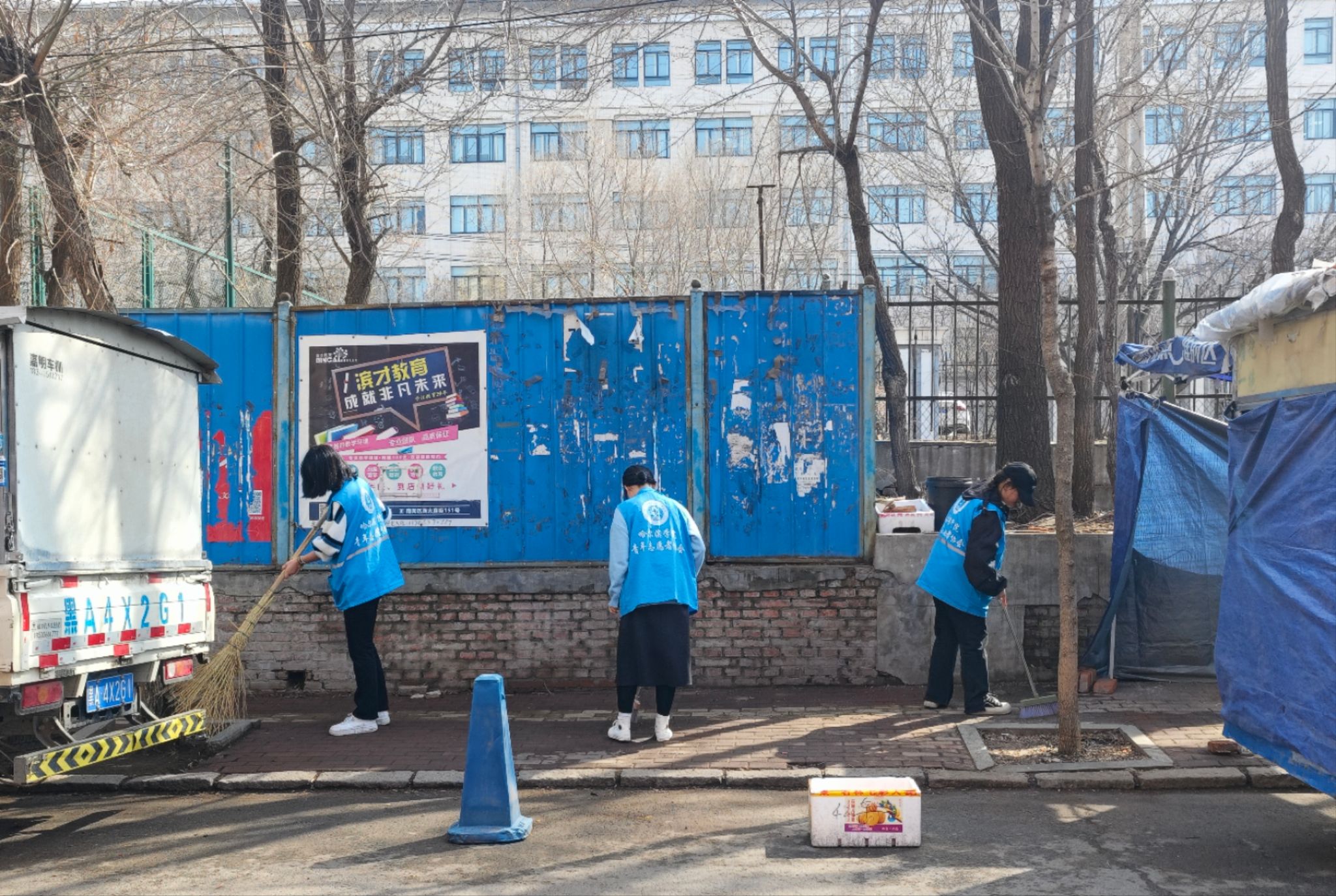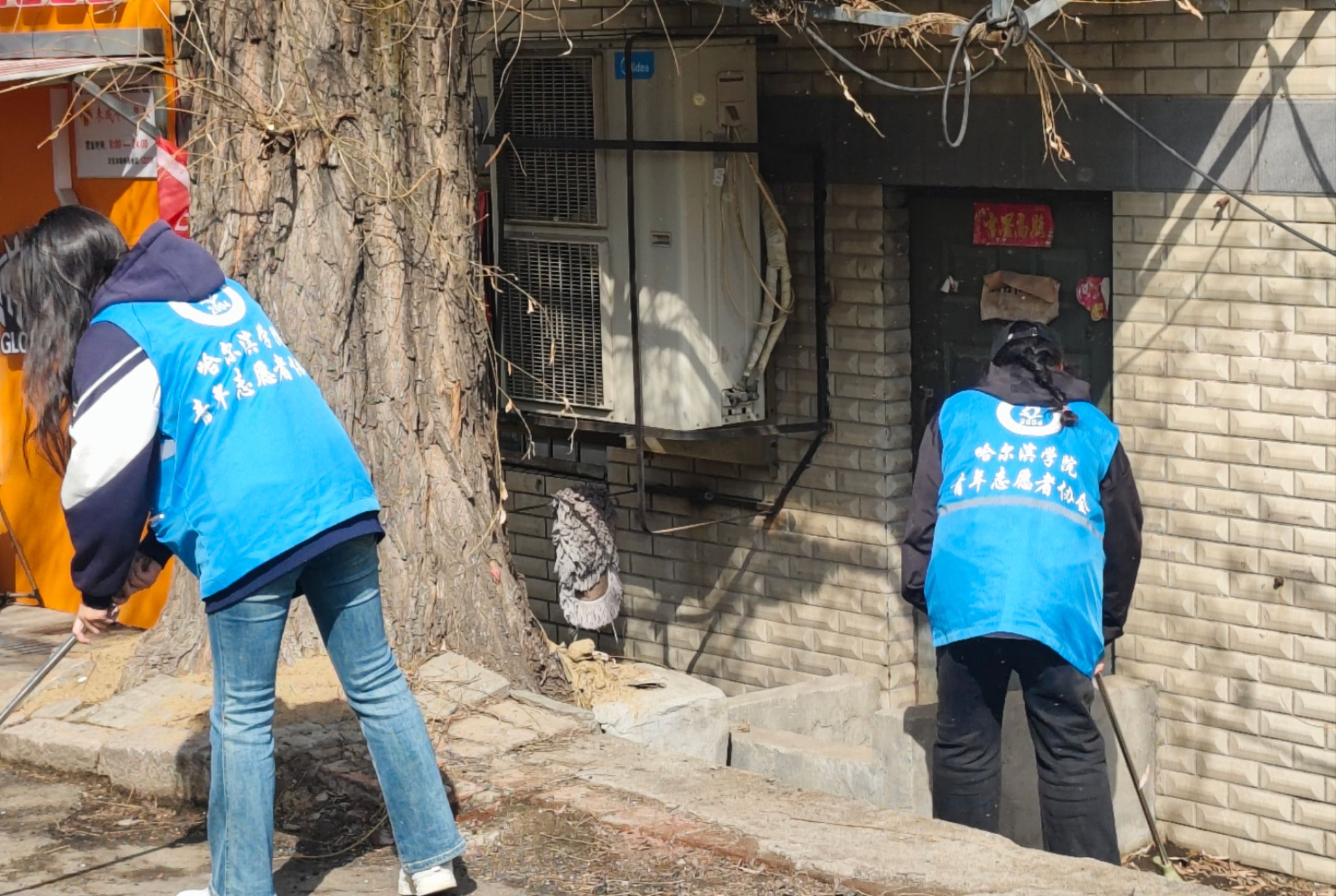 活动当天,志愿者们早早来到指定地点集合,身着统一的蓝色志愿者马甲,带着劳动工具迅速投入到环境治理工作中。在街道旁、马路边、商铺前、快递站等地都能看到勤劳的蓝色身影,他们认真清扫着街道上的落叶树枝、食品包装袋、包装盒,被遗落的快递袋等杂物。经过几个小时的辛勤劳动整个街道变得干净整洁、焕然一新,他们用实际行动展现出了哈院青年志愿者的使命担当。