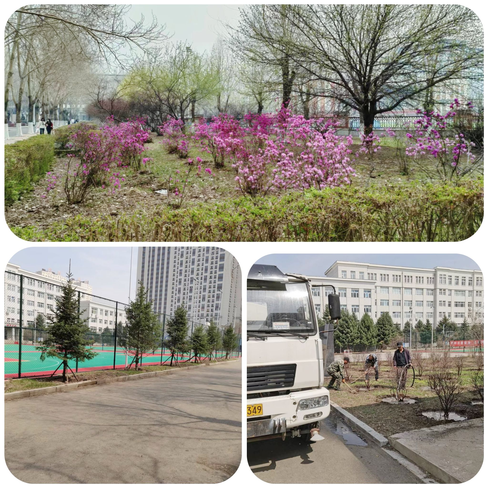 近日,由后勤管理处园林绿化科牵头,班子成员带队,专业绿植工作人员组成的植树绿化工作队在校园里陆续栽种了近300株灌木或乔木,包括丁香剧场东侧绿地内栽植红叶榆叶梅球46株,艺术校区篮球场周边补植云杉6株,八公寓门前绿地栽植樱桃、李子、山杏、沙果等花灌木30余株,艺术学院音乐楼南侧(新天地超市旁)栽植各色丁香200余株,这近300株树木有的已经开花,棵棵如同点缀校园的明珠,为校园带来了生机和活力。