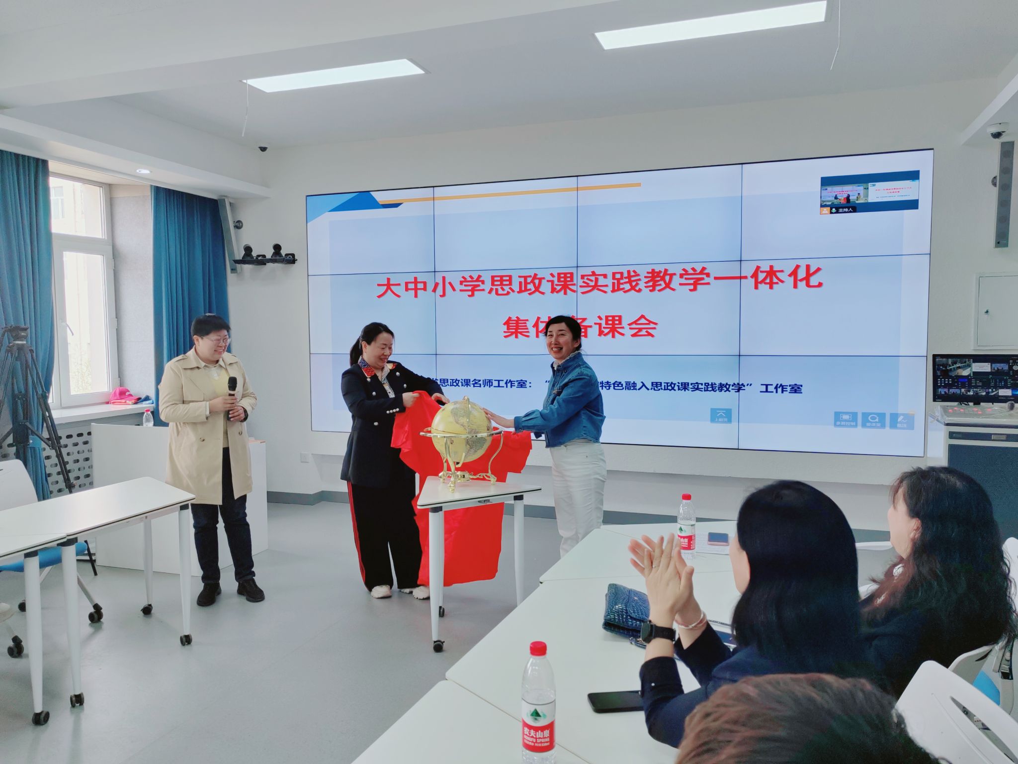 线上线下大中小学思政课教师围绕“培养什么人、怎样培养人、为谁培养人”这一核心问题,深入探讨了如何深刻理解大学、中学、小学各个学段思政课程之间的内在关联、递进逻辑及其发展规律。大家一致认为,思政课是落实立德树人根本任务的关键课程,要坚持以立德树人为根本,以提高学生核心素养为目标,加强不同学段的校际合作,构建思政课实践教学一体化共同体,共同推动思政课实践教学高质量发展。刘学伟院长代表黑龙江东方学院马克思主义学院向名师工作室赠送了“地球仪”,寓意着两校在思政课实践教学改革上的携手同行、共同进步。