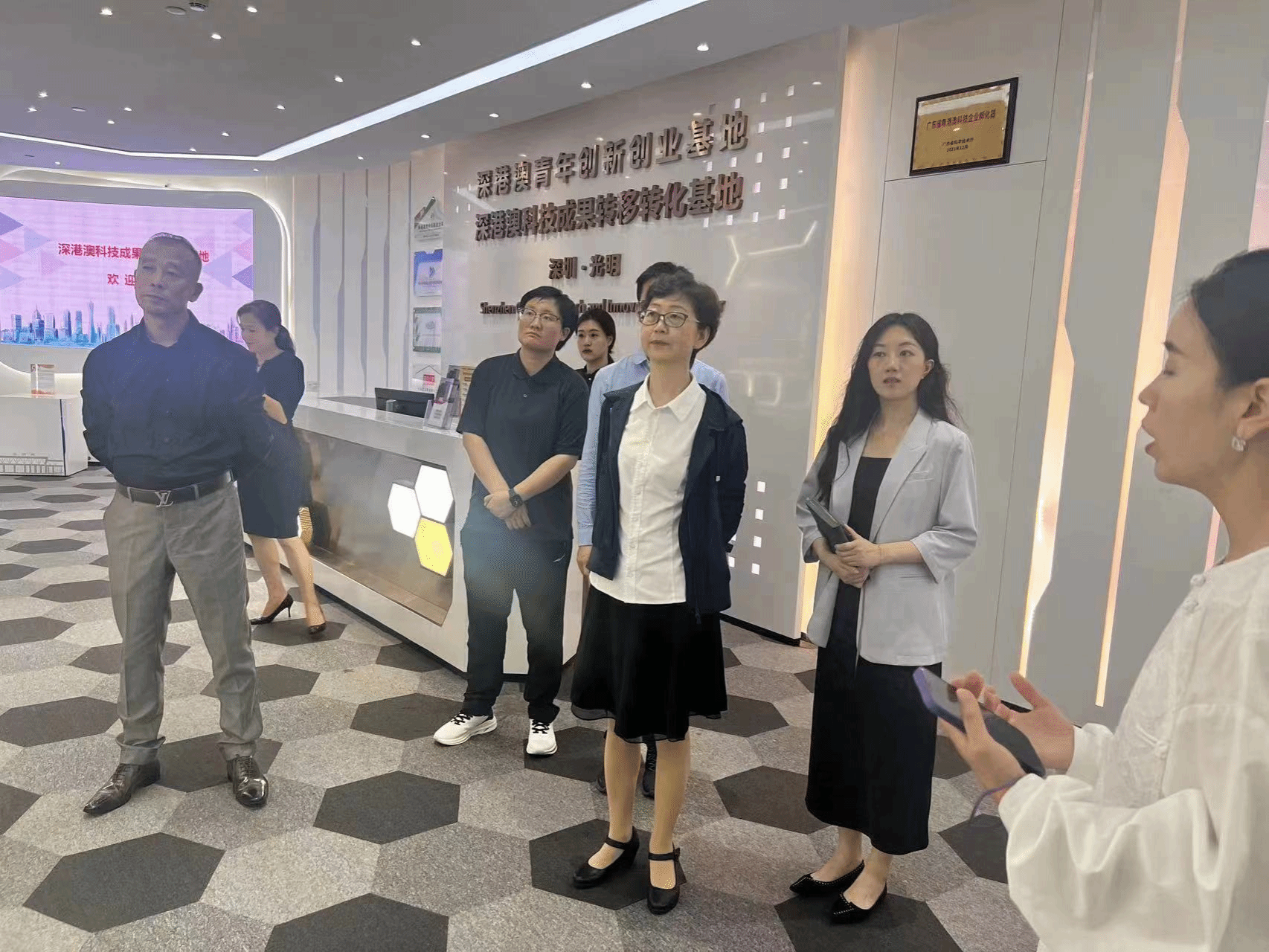 随后,调研团队参观了华强高新产业园展示中心、企服中心、创领寓、深港澳基地,深入了解园区内关于政府服务平台、园区500家企业的构成及规模、企业入驻机制、人才引进政策及岗位需求等情况。深港澳青年创新创业基地负责人带领调研团队参观了基地孵化企业的过程,以及基地目前取得的知识产权成果。