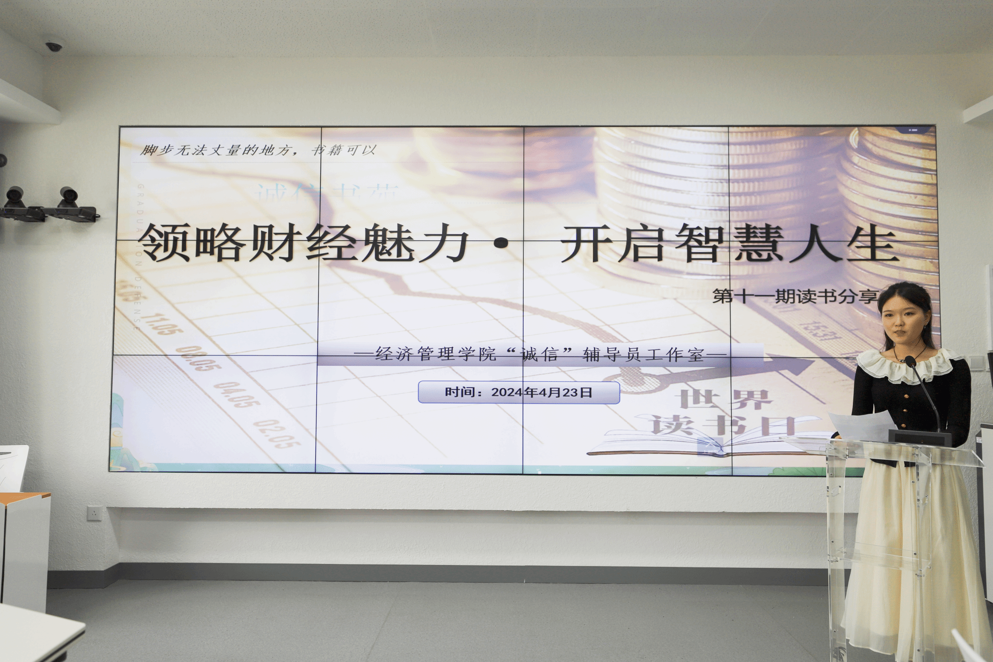 (文/高晶)为深入贯彻落实习近平总书记关于推动全民阅读、建设书香社会的重要指示精神,丰富校园文化生活,加强青年思想引领,涵养良好的学习、阅读习惯,助推优良学风建设。4月23日,在第29个“世界读书日”到来之际,经济管理学院“诚信”辅导员工作室在1号教学楼智慧思政实践教育基地举行诚信书苑“阅读·悦心”第十一期读书分享活动。校党委宣传部副部长朱明、学生处副处长张强、经济管理学院班子成员、“诚信”辅导员工作室全体成员、师生代表参加本次活动。特邀经济管理学院23级班主任王丽丽、于天琦老师,金融系高忠坡、刘雪峰老师担任点评嘉宾,活动由高美煜同学主持。
