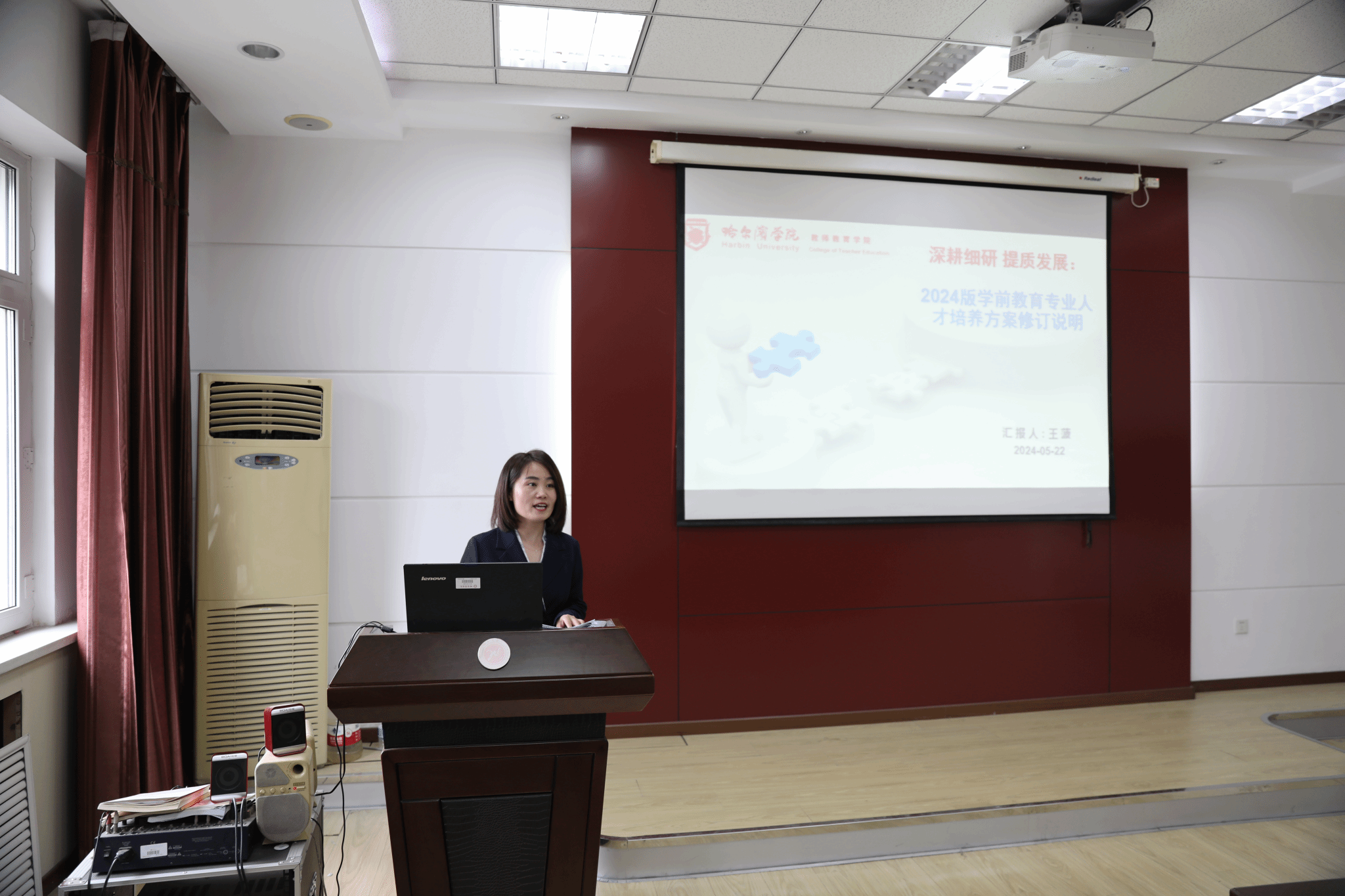 论坛由姜艳丽致开幕词,她首先对各位专家的到来表示热烈的欢迎,向她们详细介绍了哈尔滨学院的办学理念、区域特色和服务区域社会经济发展取得的成绩,并恳请与会专家为学前教育专业2024级人才培养方案修订把脉把关,希望各位专家对课程体系、专业课程、方向课程、拓展课程、教学实践等方面提出宝贵意见建议,学校将从完善人才培养方案入手,提高学前教育专业人才培养的质量,从而推动学前教育专业人才培养工作高质量发展。学前教育专业系主任王菠向与会专家与教师介绍《学前教育专业2024版人才培养方案(修订稿)》。