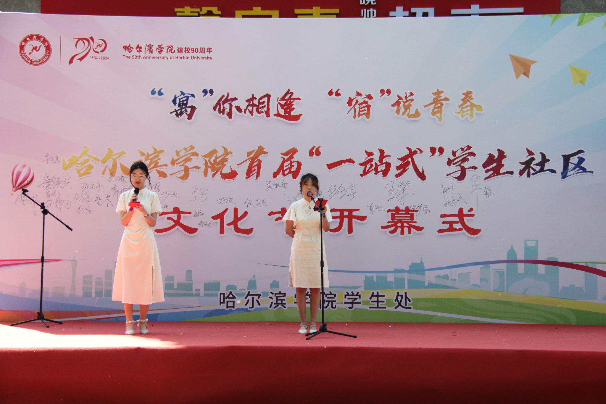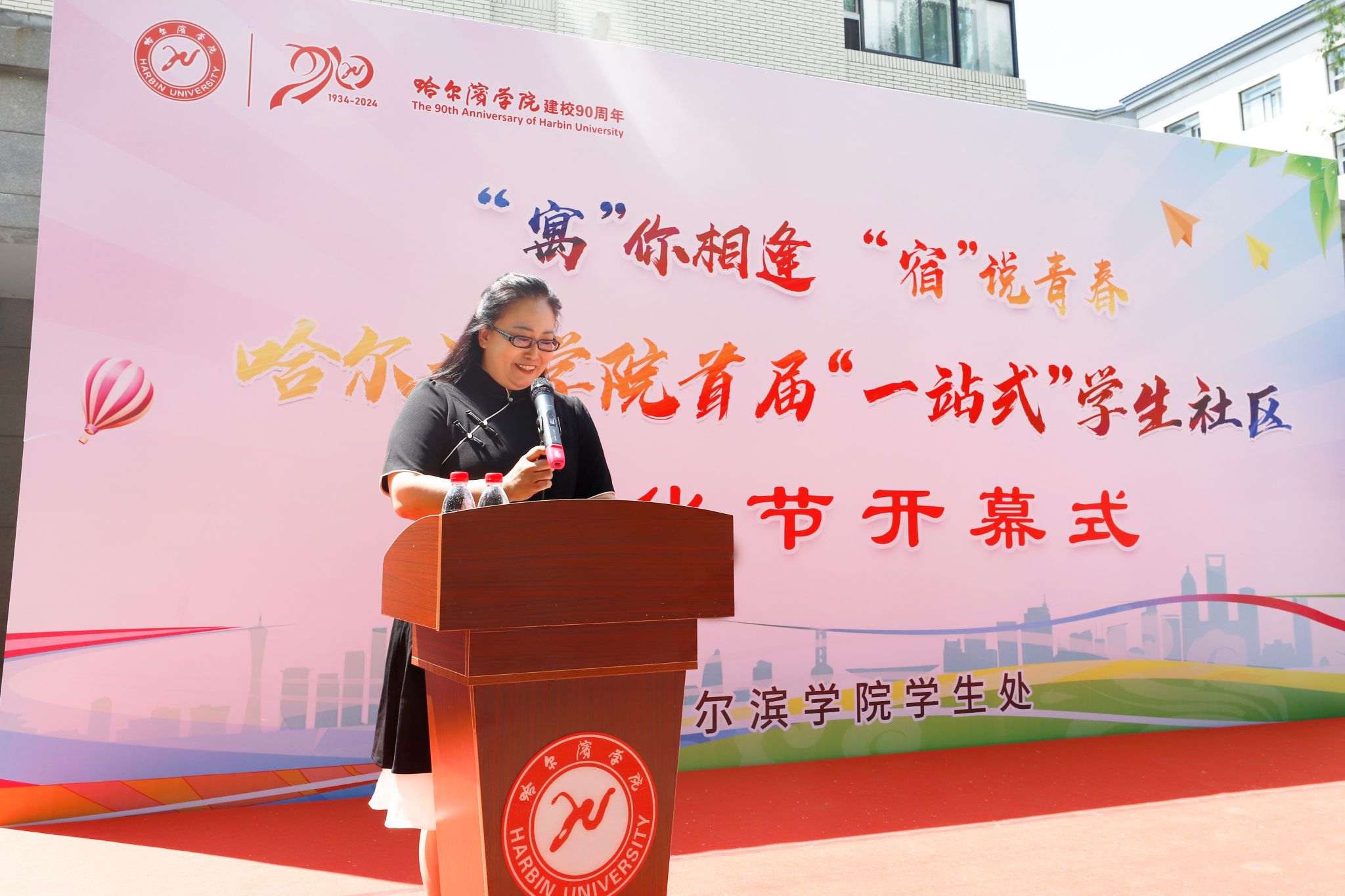 为贯彻落实习近平总书记关于教育的重要论述和党的二十大精神,扎实推进我校“一站式”学生社区内涵建设,丰富学生社区文化生活,提升社区育人质效,5月24日中午,学校在学生第四公寓门前广场举办哈尔滨学院首届“一站式”学生社区文化节开幕式。党委委员、副校长吴旭峰出席活动并宣布文化节开幕,学生处正处级辅导员丛全喜为开幕式致辞,学生处舍务管理科科长李丹主持开幕式。学生处处长于迪及学生处全体人员、全体辅导员、学生代表参加开幕式。