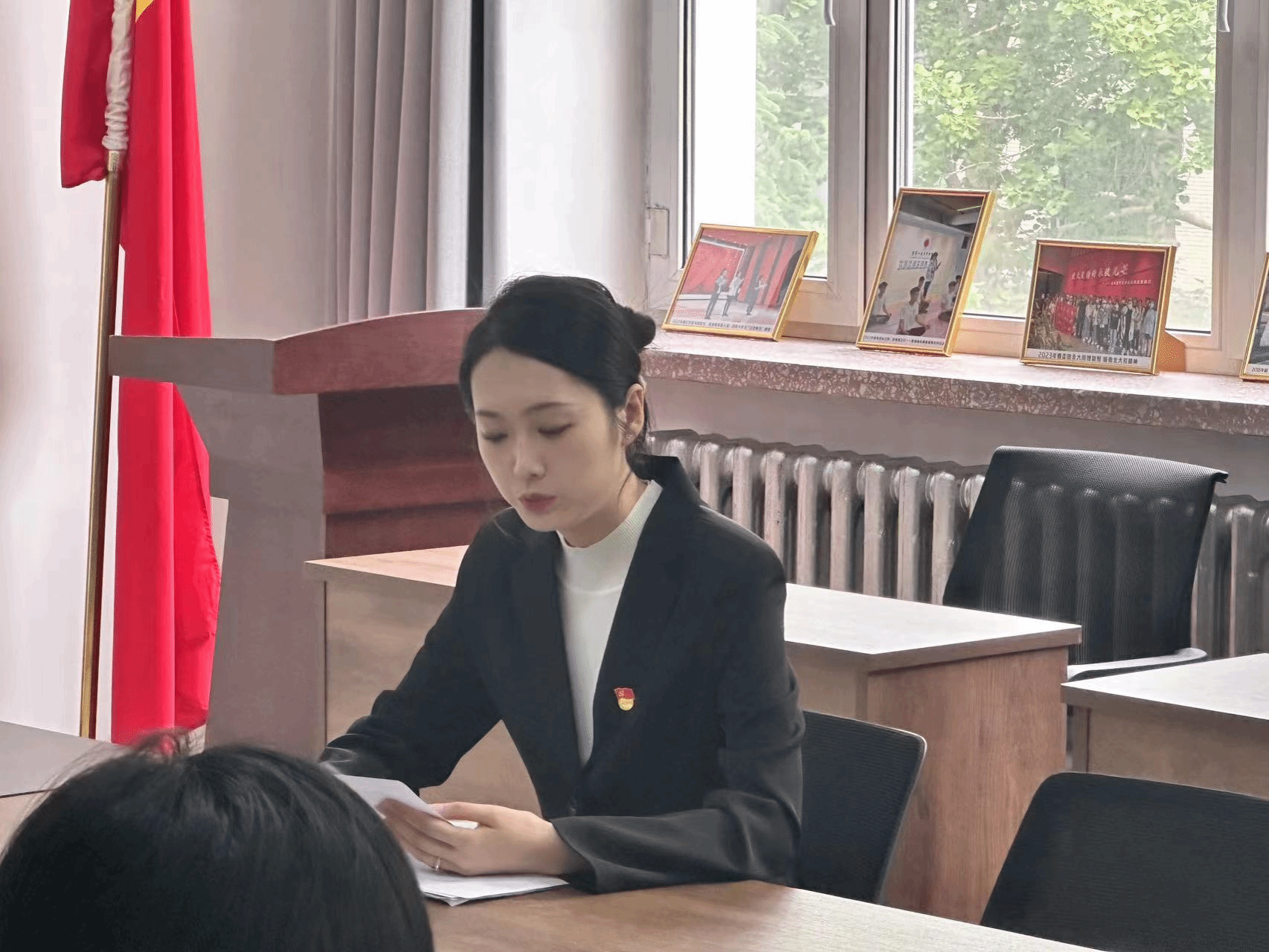 最后党总支书记孙芳同志作总结,她首先祝贺2名新同志光荣加入党组织,表示理解两名同志激动的心情,肯定了他们一直以来为党组织和学院做出的贡献。在学习和工作上2名同志用实际行动树立了“一个党员就是一面旗帜”先锋模范榜样。并对全体同学寄予殷切期望,希望全体学生向他们看齐。其次,孙芳同志强调入党是一种政治信仰,入党是一份责任担当,马院需要真正的为党组织、为学院、为同学们做实事的党员。希望全体学生监督,在发展党员工作中严格政治标准,确保发挥作用。最后,她对入党积极分子提出要求,入党动机要明确,党组织在日常工作学习和生活中全面考验大家。