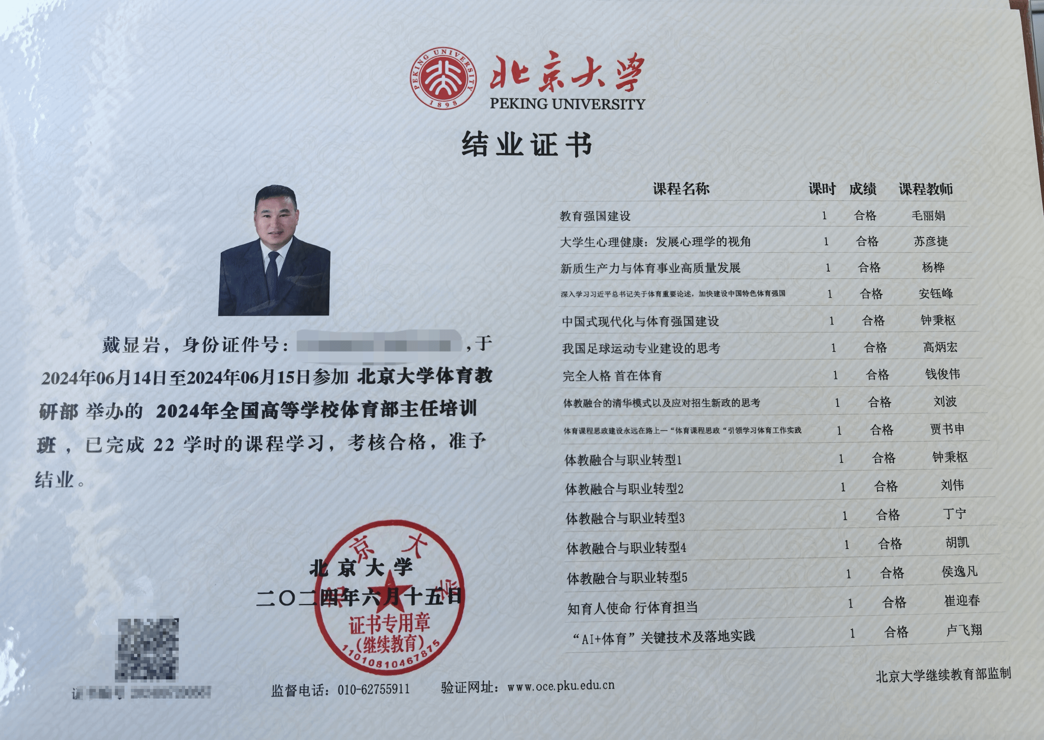 培训期间,戴院长与众多专家同仁们一道聆听了国内著名体育领域专家的精彩讲学,他们分别从不同角度,多个维度出发阐述了高校体育发展理念,为各位领导者提供了宝贵的参考与启示。此外,本次活动还安排了一场别开生面的冠军圆桌交流会,邀请了多位世界冠军及教练员们分享其体育人才培养的经验与心得,让参会人员受益匪浅。经过四天紧张而又充实的学习与交流,戴院长圆满的完成了全部课程学习任务,并获得由国家教执委颁发的结业证书。