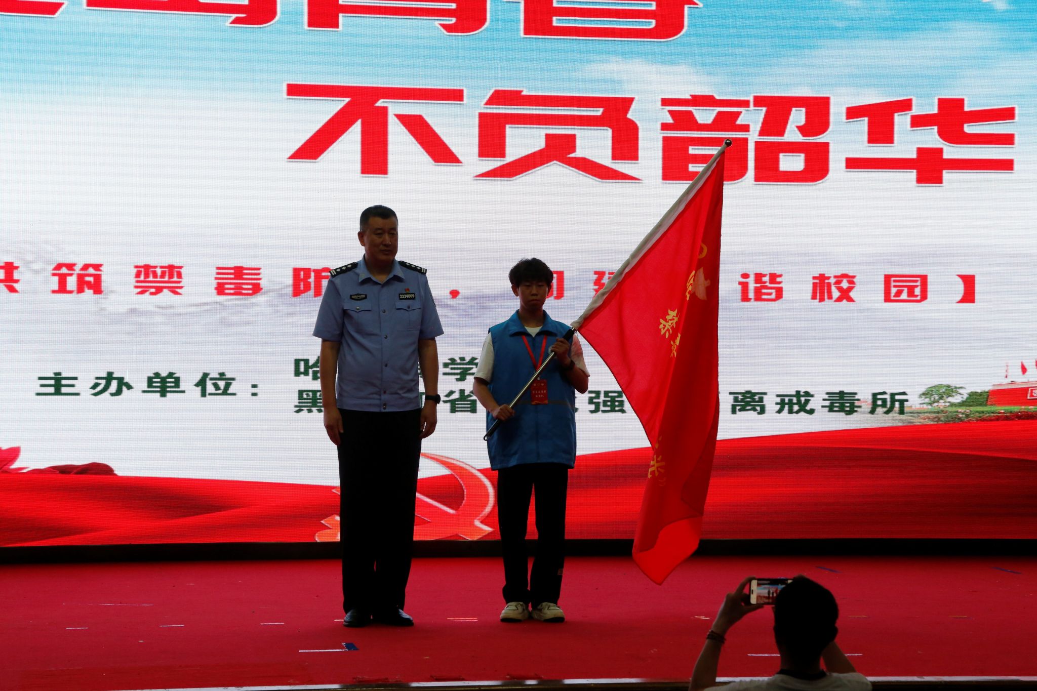 报告会后,举行了哈尔滨学院“冰城之光”大学生禁毒志愿者服务队成立大会。黑龙江省松北强制隔离戒毒所党委委员、副所长董学楠为“冰城之光”大学生禁毒志愿者服务队授旗;信息工程学院学生徐宝勇作为志愿者代表发言,他强调“禁毒志愿者服务队旨在号召带动同学们积极参与到禁毒的实际行动中去,让毒品无所遁形”“作为禁毒志愿者服务队队员将积极参与各类禁毒宣传活动,向公众普及毒品的危害和禁毒的重要性”“为那些受毒品侵害的人们提供帮助和支持,让他们重新找回生活的希望”;在“校外辅导员”宋媛的带领下,全体志愿者进行了庄严的禁毒宣誓,发出了“将积极投身禁毒行列,从现在做起,从我做起,抵制毒品,参加禁毒,珍爱生命,远离毒品,做到毒品一日不绝,行动一日不止”的铮铮誓言。