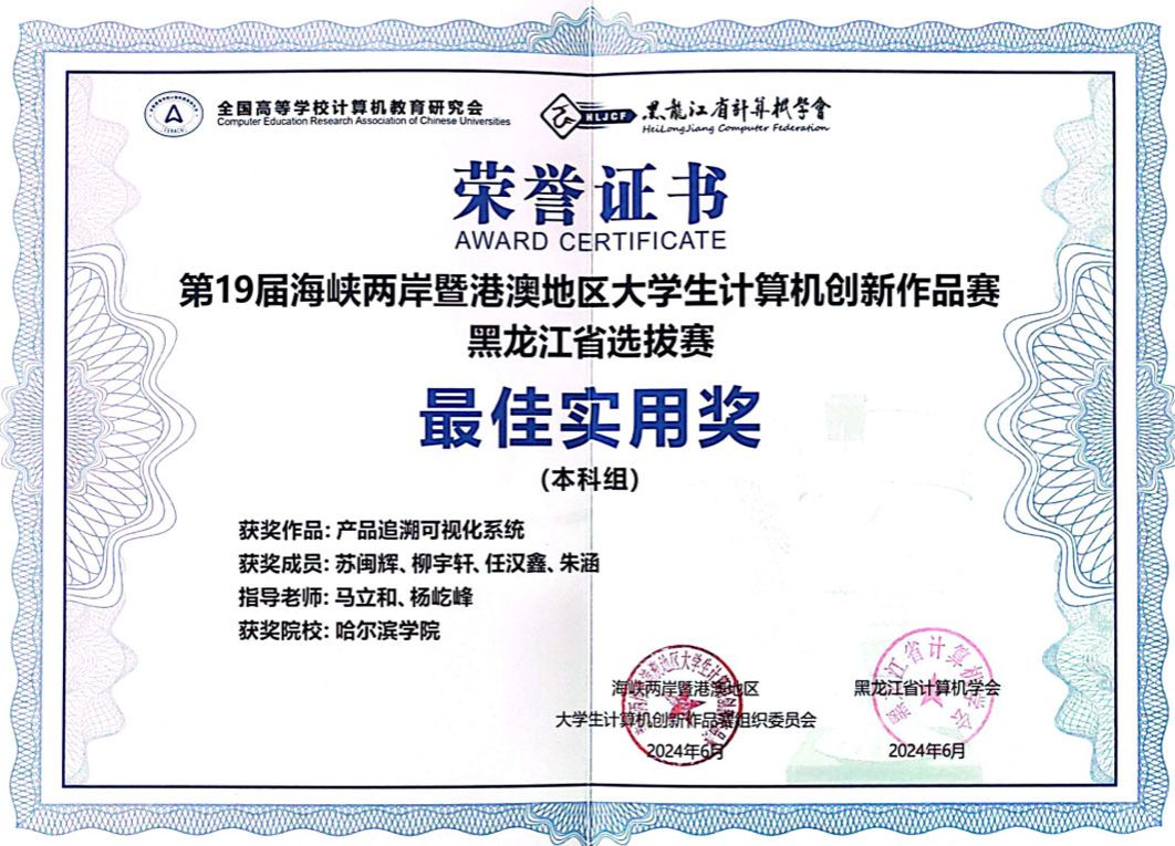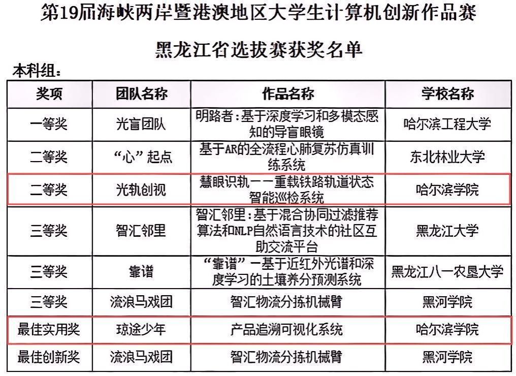 (文/宋碳)由全国高等学校计算机教育研究会主办,黑龙江省计算机学会、哈尔滨工程大学共同承办的第19届海峡两岸暨港澳地区大学生计算机创新作品赛黑龙江省赛区选拔赛,在哈尔滨工程大学启航活动中心正式开赛,本届赛事共吸引我省21所高校参赛,在比赛现场,选手们以饱满的热情、精湛的技能,呈现了一场场视觉与智慧的盛宴。在比拼中,各参赛队伍展现出了卓越的实力与创意。最终宋碳老师指导的参赛队伍获得二等奖,马立和老师指导的队伍获最佳实用奖。其中,获得二等奖的作品《慧眼识轨——重载铁路轨道状态智能巡检系统》将代表黑龙江省参加今年7月在澳门理工大学举行的海峡两岸暨港澳地区大学生计算机创新作品赛总决赛。