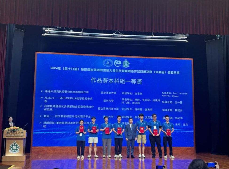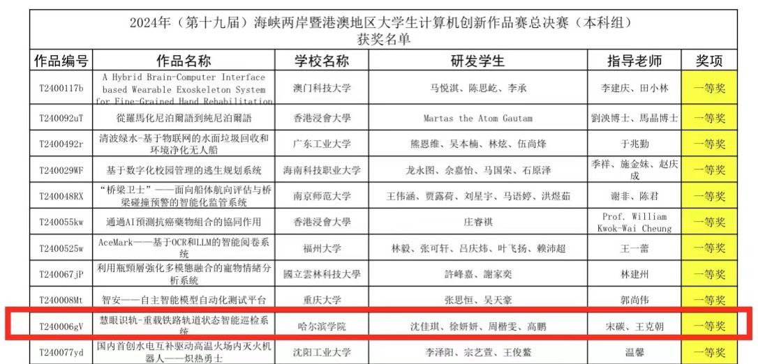 (文/宋碳)7月25日,由全国高等学校计算机教育研究会主办,黑龙江省计算机学会与多个省(市、地区)的计算机学会联合主办的2024年(第十九届)海峡两岸暨港澳地区大学生计算机创新作品赛全国总决赛在澳门理工大学圆满落幕。经过激烈角逐,我校信息工程学院沈佳琪、徐妍妍、周楷雯和高鹏同学组成的哈尔滨学院代表队(指导教师宋碳、王克朝),参赛项目《慧眼识轨——重载铁路轨道状态智能巡检系统》获得总决赛(本科组)一等奖。