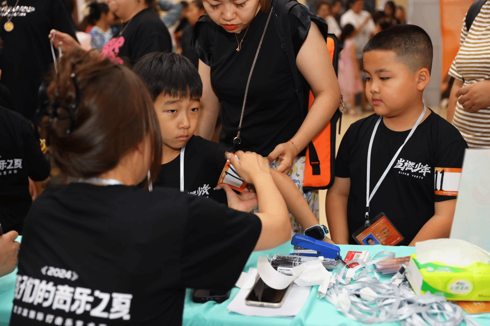 在精彩的架子鼓表演中,艺术节正式拉开帷幕,并迅速攀升至高潮。检录处工作人员正紧锣密鼓地为参赛选手们进行排序工作,确保比赛有序进行。选手们怀揣着紧张与兴奋的心情等待着,渴望在舞台上尽情展现自己的风采。比赛过程中,小鼓手们精神饱满,活力四溢,他们挥舞着鼓棒,击打出激情四溢的节奏,展现出非凡的音乐才华。现场鼓声轰鸣,震耳欲聋,观众们仿佛被带入了一个充满力量与激情的音乐世界之中。