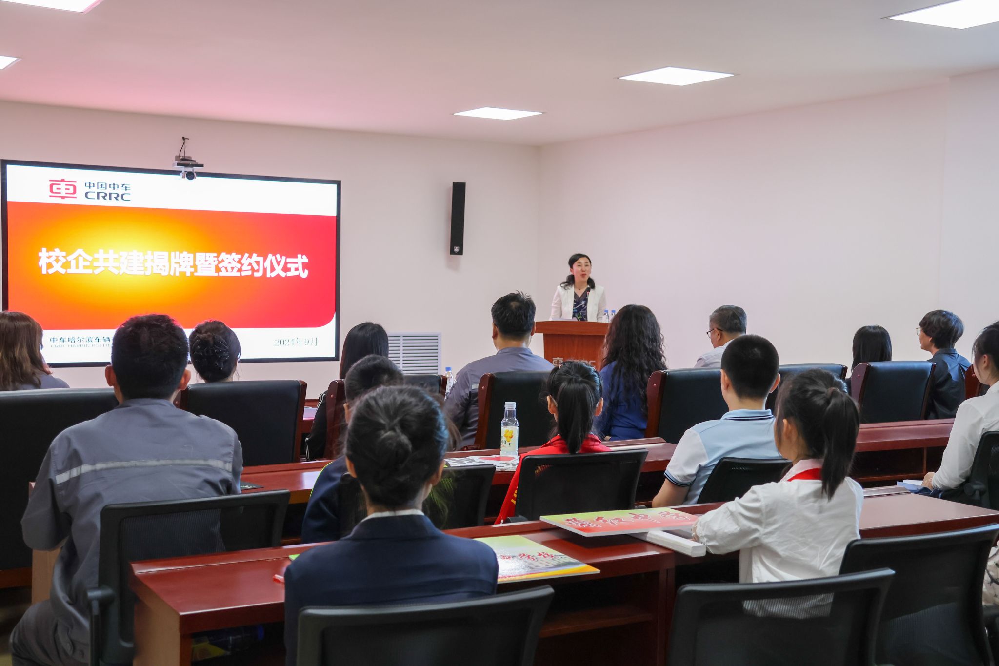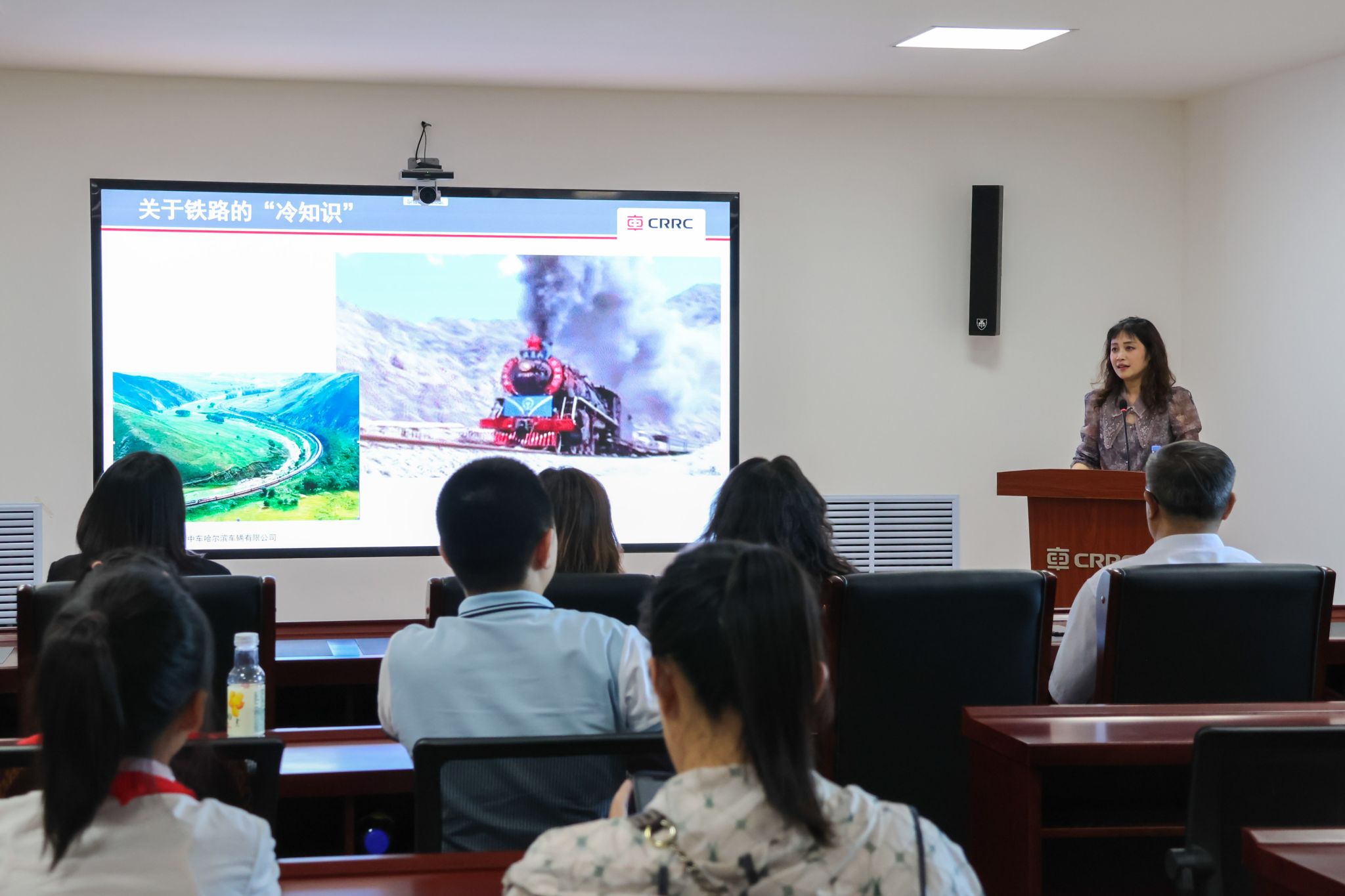 仪式上,中车哈尔滨公司副总经理郑景龙致辞。他首先向各位老师致以第40个教师节的节日祝福,并介绍了中车哈尔滨公司百年发展历程。随后,他围绕共建校企合作基地和实践教学基地,就开展科学研究、课题合作、成果交流、共同打造协同育人模式等方面提出了建议。哈尔滨学院马克思主义学院党总支书记孙芳也发表讲话,她向支持学院开展实践教学活动的中车哈尔滨公司表示衷心感谢,并结合学院前期开展的相关研究进行了交流分享。中车哈尔滨公司工程师岳娜和高级工程师徐长胜分别以“铁路冷知识”和“演示站场装备系列产品设计原理”为主题,为师生们带来了一场生动的科普小课堂。