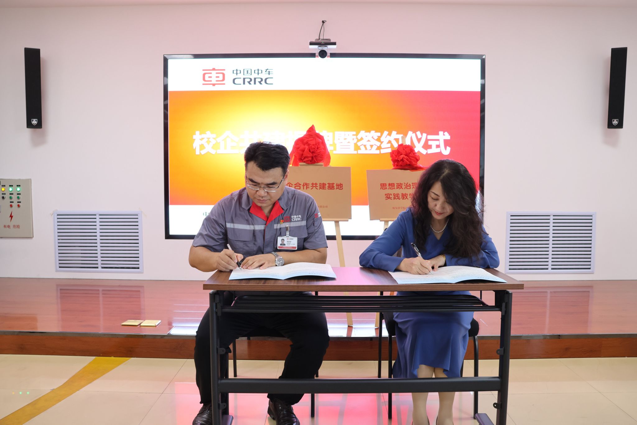 活动伊始,哈尔滨学院与中车哈尔滨公司举行了共建校企合作基地、思想政治理论课实践教学基地协议签约及揭牌仪式。仪式由省思政课名师工作室负责人安慧玉教授主持。哈尔滨学院马克思主义学院党总支书记孙芳与中车哈尔滨公司党委委员、副总经理、总工程师郑景龙,共同为基地揭牌并签订协议。