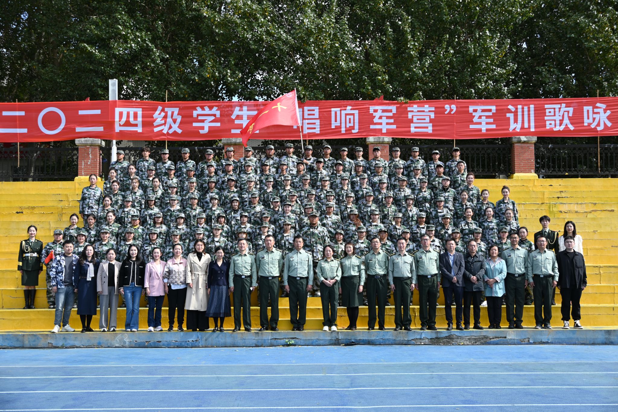 (文/李一宁)凯歌而行,不以山高为远;乘歌而上,不以日月为限。9月17日上午,由校团委主办的“九秩风华映军绿,校庆欢歌谱新章”2024级学生“唱响军营”军训歌咏比赛在学校运动场举行。校党委委员、副校长吴旭峰,军训旅副旅长刘绍进,团委副书记张玉娟,学生处副处长庞哲以及各学院党委(总支)书记,副书记,分团委书记,辅导员和2024级全体新生共同观看比赛。音乐与舞蹈学院音乐表演专业声乐教研室主任修雪卿、音乐表演专业声乐教师梁雪、音乐学专业声乐教师陈艳、赵文佳、音乐表演专业声乐教师邱洋洋担任本场比赛的评委。