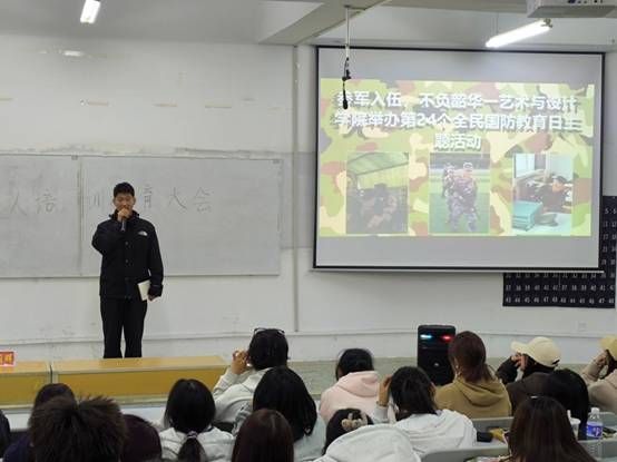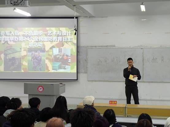 活动在四号教学楼的331教室举行,艺术与设计学院党委书记孙国辉及100多名同学参加了活动。现场气氛热烈而庄重,退伍大学生士兵代表们逐一上台,用生动的语言和感人的故事,向在场的师生们讲述了自己的军旅生涯,分享了在部队中的成长历程、挑战与收获,以及退伍复学后的心路历程。这些故事不仅展现了当代青年学子的责任与担当,更传递了强烈的爱国情怀和国防意识。