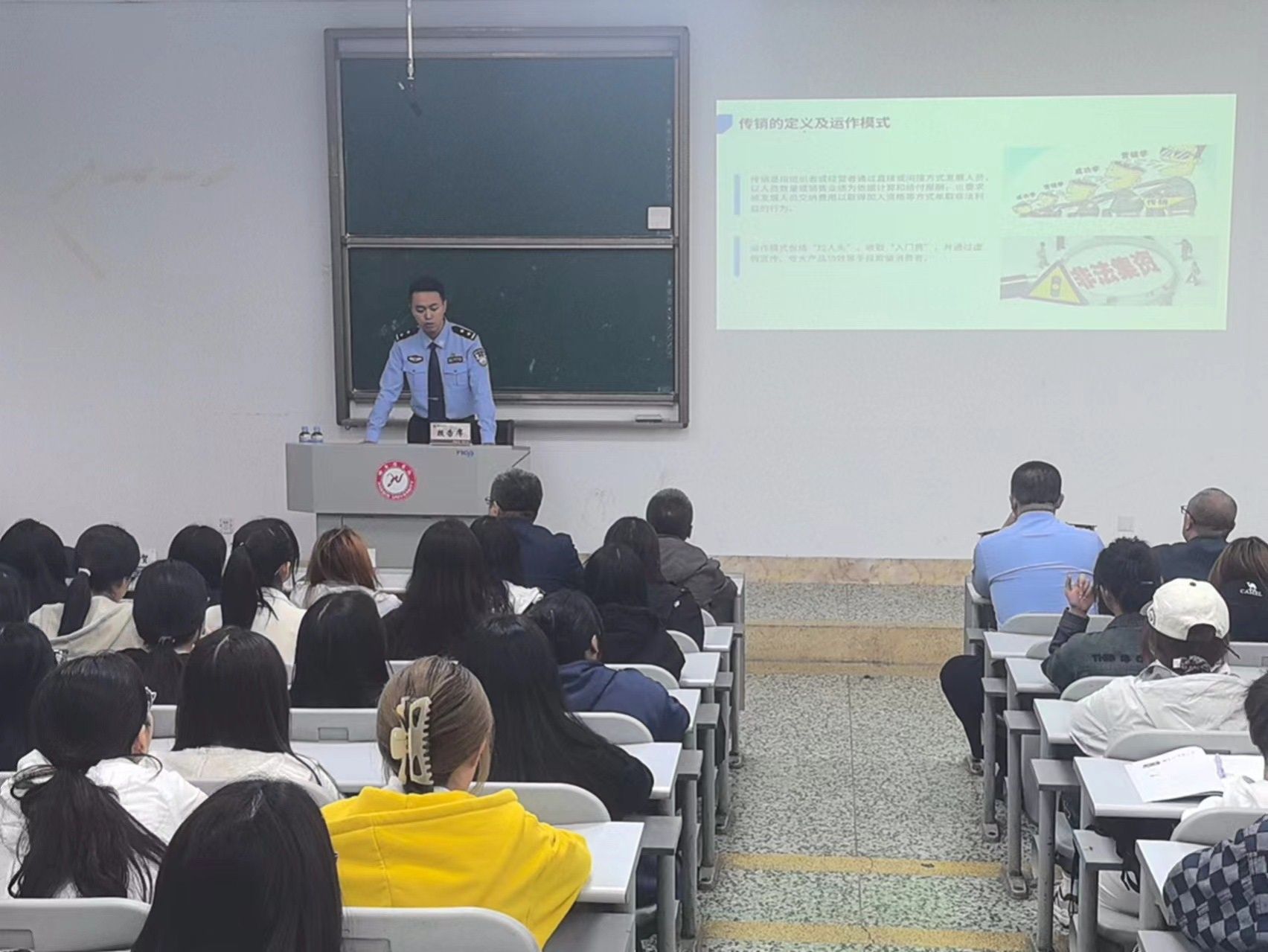 张远志警官以《大学生如何防范非法集资与传销》为题,从非法集资与传销概念、非法集资与传销犯罪给学生带来的危害、当前大学生面临的风险和挑战、识别非法集资与传销技巧、防范非法集资与传销策略、法律法规普及与教育意义六个方面为同学们进行了讲解,提醒同学们尤其注意防范校园内非法集资诱惑、网络传销渗透、求职陷阱等违法犯罪现象,张警官寄语同学们“扣好人生第一粒扣子,争做新时代好青年”。