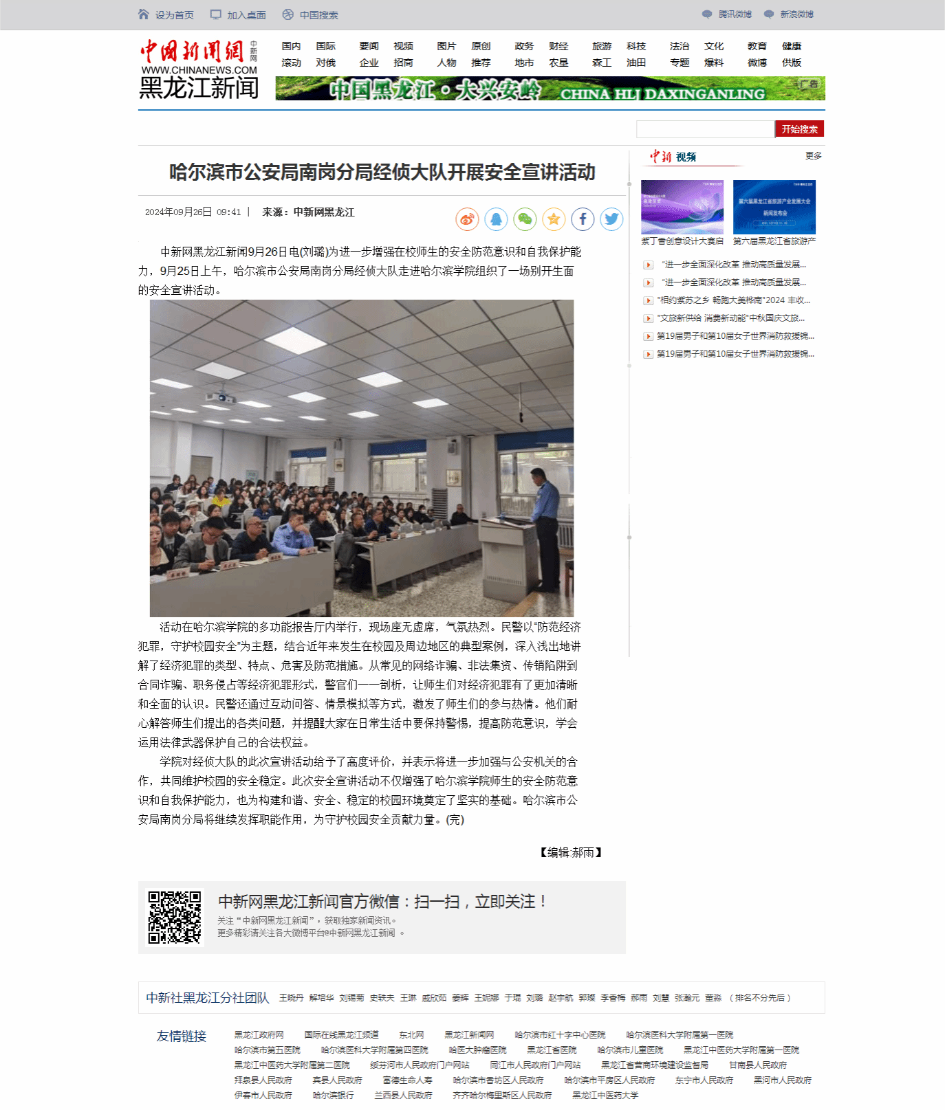(文/赵家贺)根据学校年初提出“深入开展警校共育工作,确保校园安全稳定”的工作目标,保卫处决定在秋季学期集中开展防范电信诈骗、非法集资与传销、套路贷、校园欺凌暴力等普法宣教活动。此项工作得到了哈尔滨市公安局南岗分局经济犯罪侦查大队干警的大力支持,选派经验丰富的干警进校全程参与。