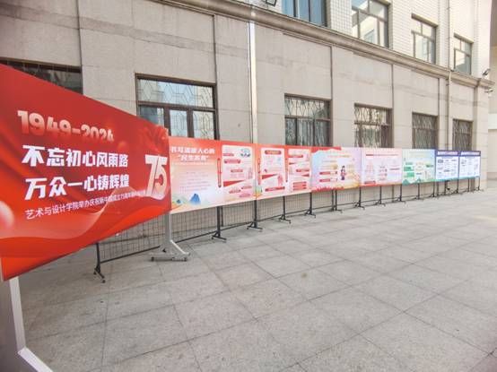 为了呈现出最佳的展览效果,参与创作的同学们在前期查阅了大量国家级媒体报道的资料,精心挑选设计元素。他们以文字、图片为基础,不断完善设计方案,力求通过视觉艺术展现新中国的发展历程和伟大成就。在创作过程中,同学们克服了多个难题,最终凭借扎实的专业基础和团队协作,圆满的完成了设计任务。