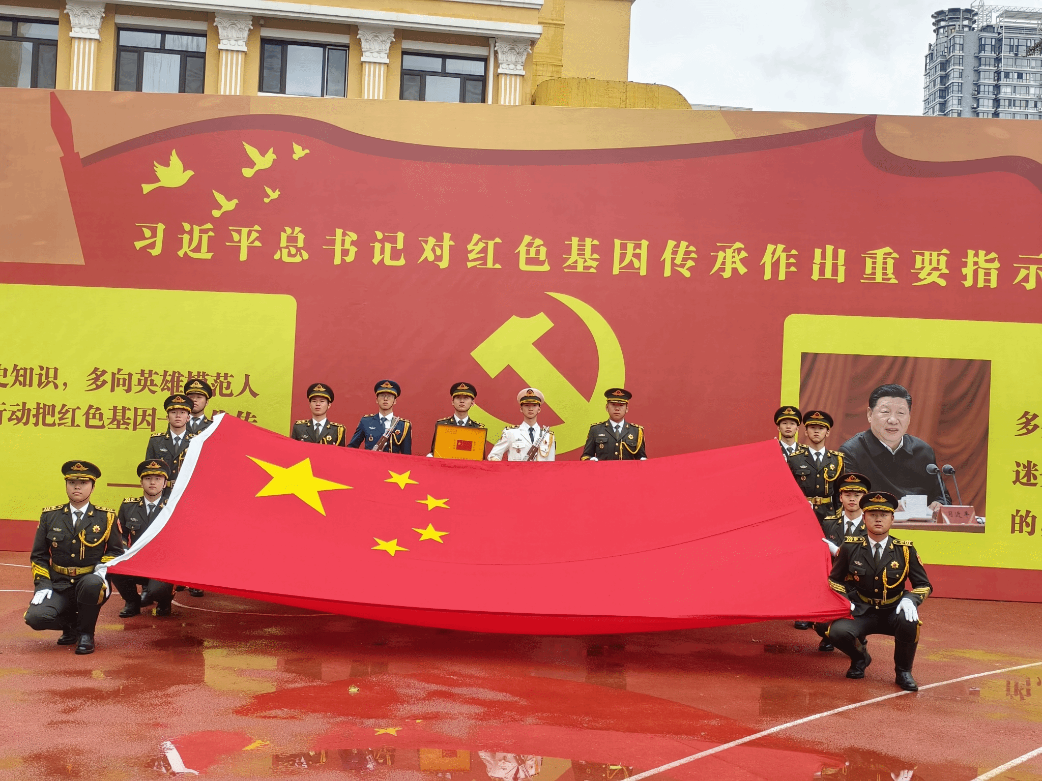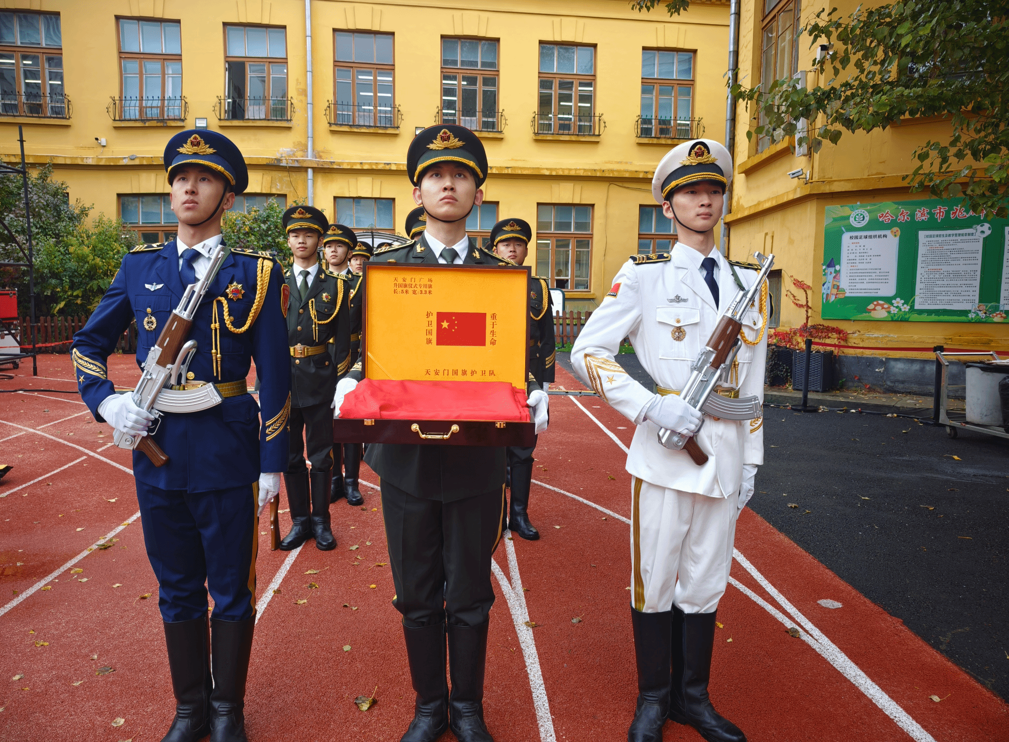 晨曦初上,我校大学生国旗护卫队队员昂首挺胸,迈着铿锵有力的步伐,护送着鲜艳的五星红旗步入兆麟小学操场。全校师生肃立,共同见证这一庄严时刻。随后,在我校大学生国旗护卫队的护卫下,与会领导向李兆麟红军小学赠送了一面曾在天安门广场上升起的五星红旗和一面由中国人民革命军事博物馆、中国人民解放军档案馆、中国国家博物馆、中国关心下一代工作委员会、全国红办把红色基因一代代传下去工作领导小组监制的中国工农红军军旗。我校国旗护卫队队员们全程参与,用行动诠释了新时代青年的责任和使命。