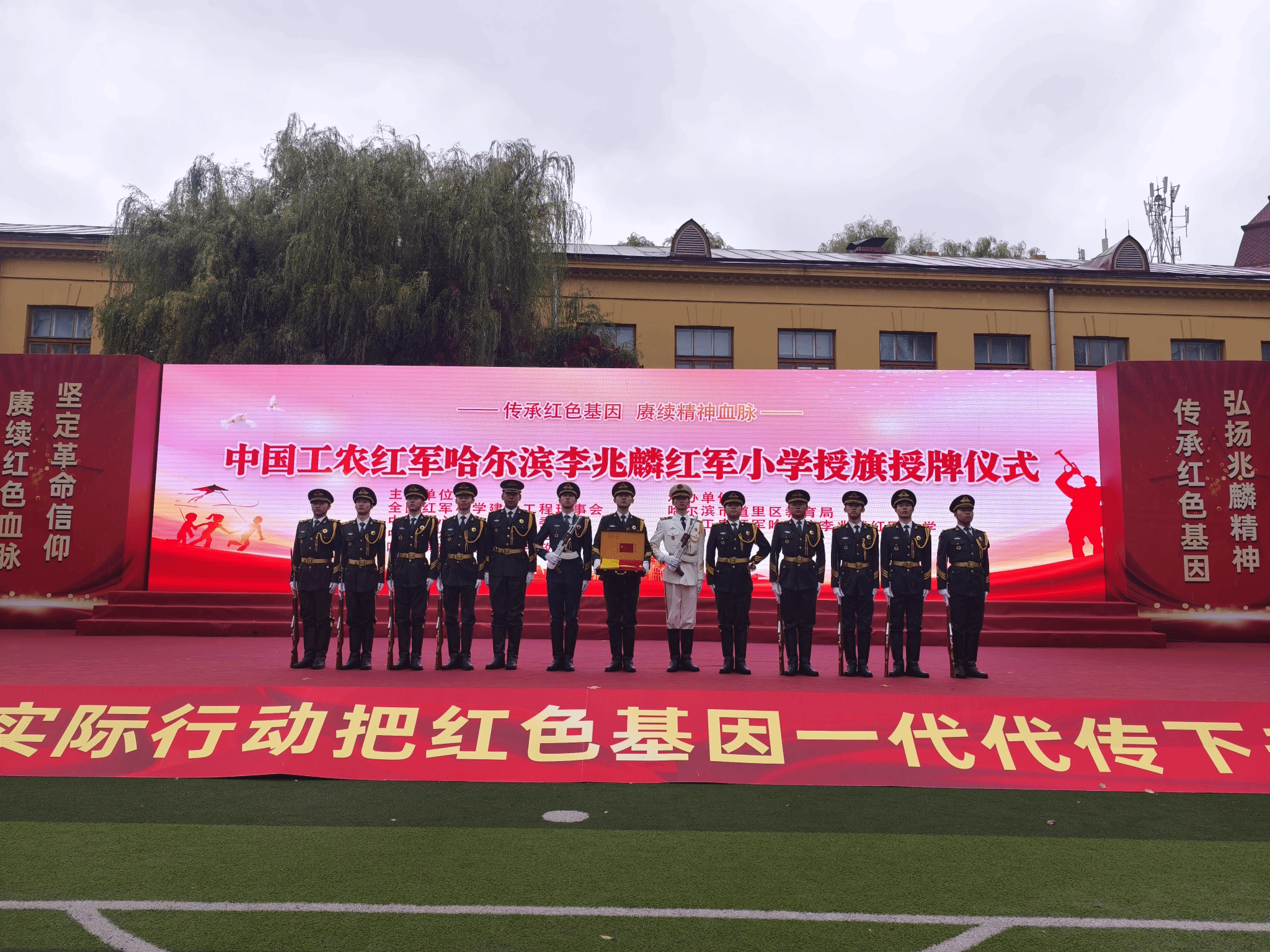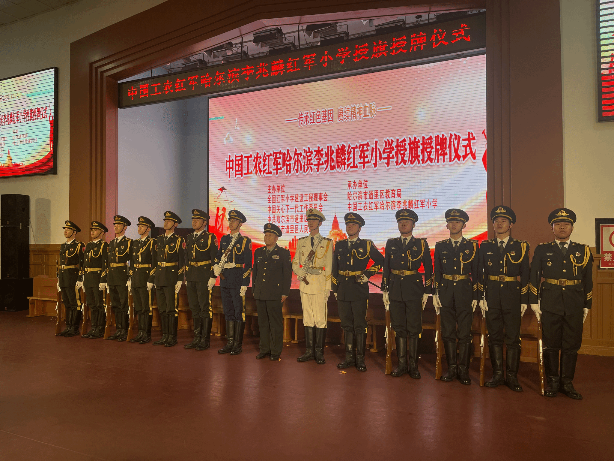 (文/李赫鹏)为发挥高校资源优势,持续打造城市德育特色品牌,积极赋能大思政育人新格局。10月10日,应中国工农红军哈尔滨李兆麟红军小学邀请,我校大学生国旗护卫队参加该校授旗授牌活动。全国红军小学建设工程办公室副理事长兼秘书长方强,第十二届全国政协委员、中国人民解放军原总参四部部长万晓援,黑龙江省委常委、黑龙江省军区政委赵忠,哈尔滨警备区大校司令杨金有,哈尔滨市道里区委书记董继文等参加了活动。